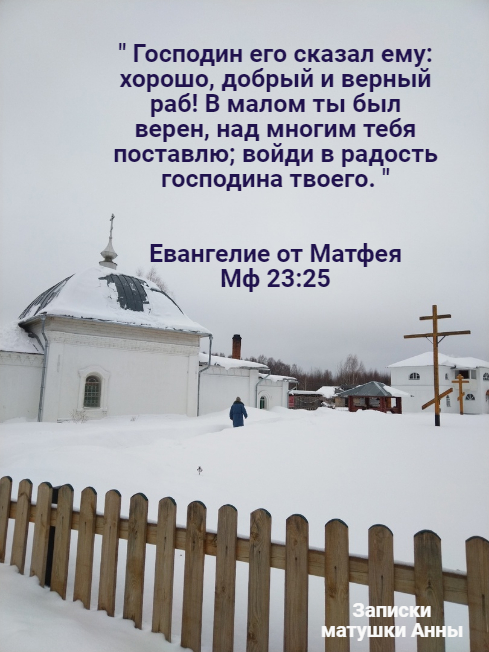 Господь в причте "О талантах", обещает каждому, кто будет верен Ему в малых земных делах- большую радость и большую духовную часть в будущем Царстве света и радости. Что подразумевается под "малой верностью" с нашей стороны? Наши малые дела: соблюдение постов, утренних и вечерних молитвенных правил, посещение церкви в воскресные и праздничные дни. А так же делание на совесть того дела, которым мы служим Господу и ближнему ежедневно, то есть наш труд, наша работа. "Да разве ж это так сложно?"- может спросить новоначальный христианин. "Дело вроде не такое уж и сложное, а награду Господь обещает большую.." Вот здесь каждому из нас и предстоит проверить на себе сложность (или простоту) малых дел, угодных Богу. Спасибо за внимание, дорогие читатели и хорошего вам дня!