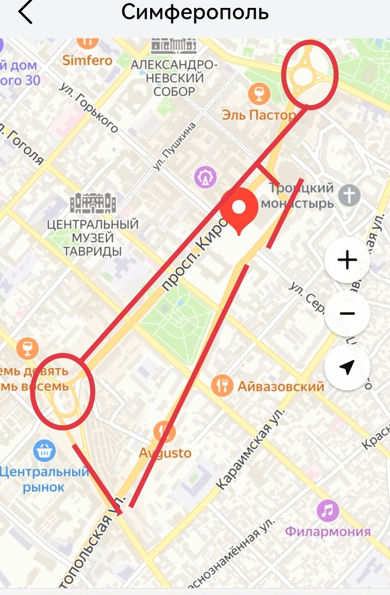 Начало здесь .... Приехав в Симферополь, я уже знала, что на площади Ленина готовится сцена и что вечером будет концерт. А ещё, что все мы точно знали, что мы - Россия. Окончательно и бесповоротно. Звонили друг другу и поздравляли как с уже свершившимся фактом. Договорилась встретиться на площади вечером со знакомыми и вместе отпраздновать - в течении трех месяцев, познакомившись под парламентом, мы этот день приближали, как могли. Наперёд забегу и скажу, что пришлось праздновать позже, вечером мы так и не нашли друг друга🙈 А я пока поехала к сыну, где обзвонив родню и знакомых, потом собрав всех, через пару часов на такси мы поехали в центр...... ....... Знаете, я никогда, ни до, ни после не видела подобного! Море людей! Просто огромное море.... И реки, которые по улочкам, отовсюду стекались к центру. Для понимания скинула карту, где показала, какой район был полностью перекрыт для транспорта. Правда, немного ошиблась, обвеля красным кольцо на Центральном рынке, оно работало