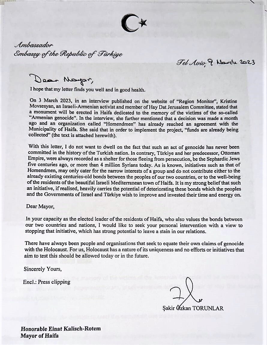 Посол Турции в Израиле, Шакир Озкан Торунлар, судя по малограмотному и полному хамских выпадов в адрес мэра израильского города Хайфа, вероятно получал образование на кафедре алиевской пропаганды бакинского государственного университета. Совсем недостойно для турецкого дипломата так унижаться, словно он какой-то Мамед из Маштагы. В этом письме посол Турции возмущается, что городской совет израильского города Хайфа единогласно признал Геноцид армян в Оттоманской империи и постановил что в городе будет установлен мемориал жертвам Геноцида. В этом письме посол угрожает прямым текстом израильскому мэру Эйнат Калиш Ротем "негативными последствиями" и "неприятностями" в случае, если мэр не отменит принятое решение. Посол показал себя настолько недалёким человеком, что даже не попросил своих советников поинтересоваться, как именно в демократическом государстве городской совет принимает решения. Роль мэра в принятии таких решения близка к нулю, это коллегиальное решение представителей обществе