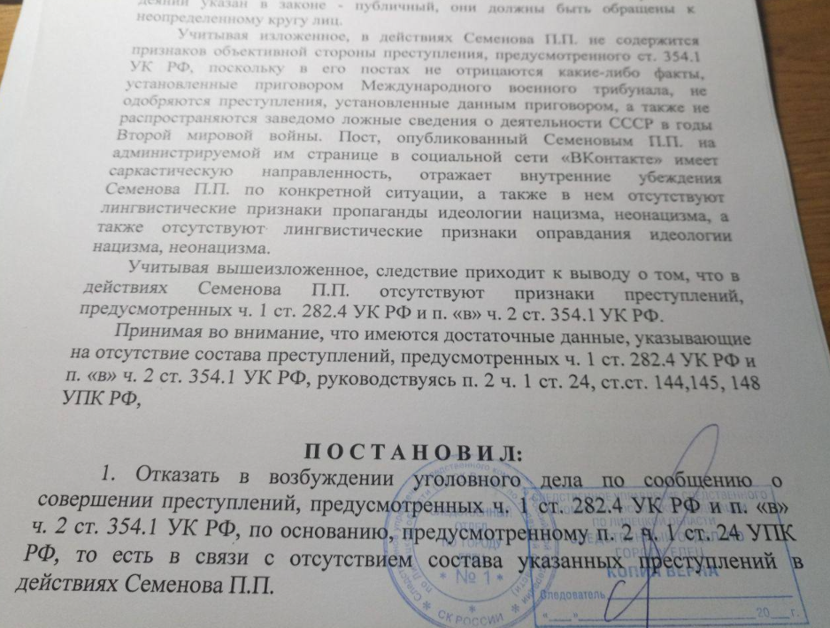 Прошедшая по поручению главы Следственного комитета РФ Александра Бастрыкина проверка не выявила в действиях и публикациях замначальника управления внутренней политики Липецкой области Павла Семёнова ничего противоправного. В возбуждении уголовного дела отказано в связи с отсутствием состава преступлений. Анонимные недоброжелатели и завистники пытались обвинить в соцсетях Семёнова в пропаганде нацизма. Но выяснилось, что не было ни пропаганды, ни нацизма. Павел Семёнов известен липчанам как главный специалист по исторической реконструкции Липецкой области, руководитель елецкого военно-исторического и патриотического клуба «Копьё» и организатор международного фестиваля «Русборг». В общем, русский патриот до мозга костей. И вдруг нацист. Началось всё с того, что Павел Семёнов в своём аккаунте в 2011 году рассказал, как будучи студентом в 90-е годы по байкерской моде ездил на мотоцикле в каске Вермахта.