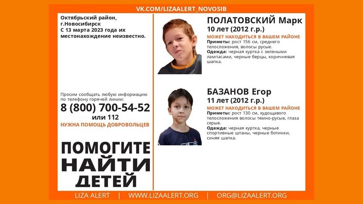 В Октябрьском районе без вести пропали 10-летний Марк Полатовский и 11-летний Егор Базанов. Как сообщили в поисково-спасательном отряде (ПСО) «ЛизаАлерт» в социальной сети «ВКонтакте», местонахождение мальчиков неизвестно с 13 марта 2023 года. «Егор, придя со школы, отпросился погулять, его отпустили до вечера, домой не вернулся. Ранее пропадал. Марк с родителями в сентябре 2022 года переехали в Октябрьский район, тогда и познакомился с Егором. Ранее пропадал», – прокомментировали ситуацию в пресс-службе отряда «ЛизаАлерт». Приметы Марка: рост 156 сантиметров, среднего телосложения, волосы русые. В день исчезновения был одет в черную куртку с зелеными лампасами, коричневую шапку и черные берцы. Приметы Егора: рост 130 сантиметров, худощавое телосложение, волосы темно-русые, глаза серые. В день исчезновения был одет в черные спортивные штаны, куртку, ботинки и синюю шапку. В комментариях к посту о поиске детей Ирина Исаенко написала, что видела их 13 марта примерно в 14:30-15:00, когда