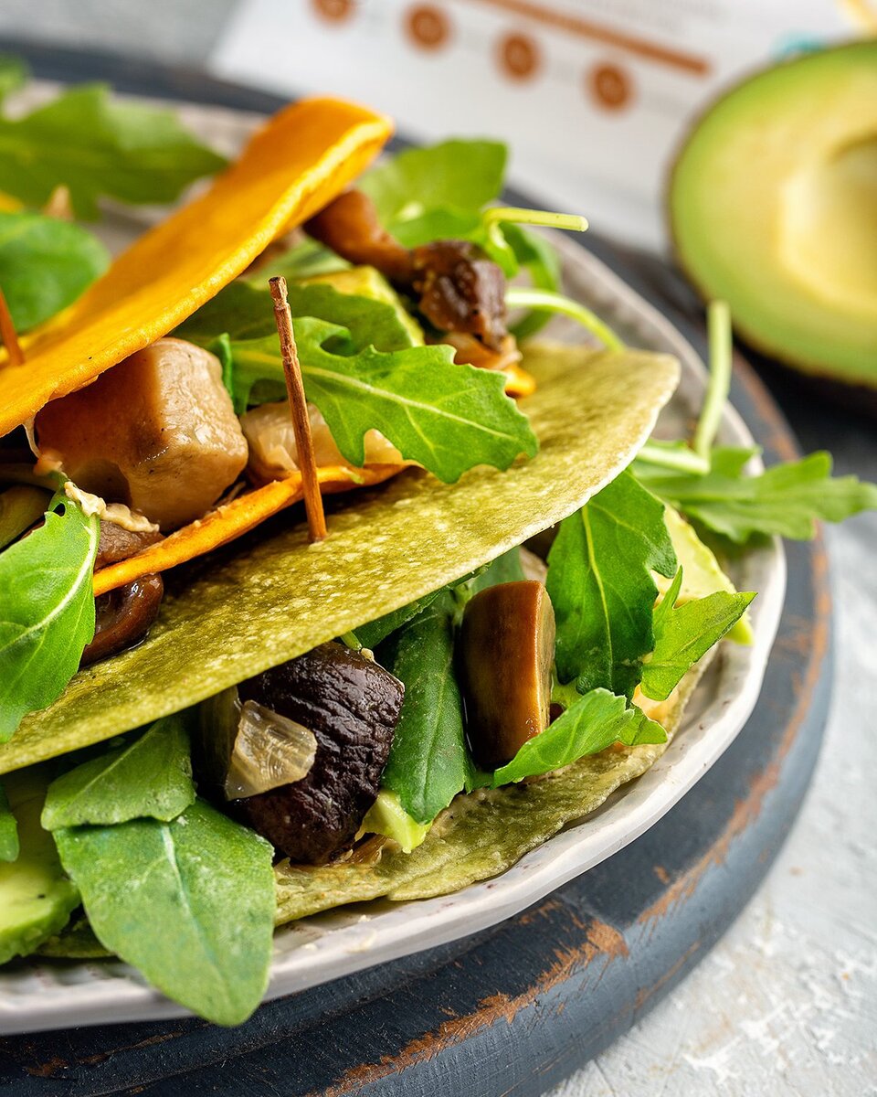 7. Добавить в равном количестве грибы и ломтики авокадо, сверху прикрыть оставшимися парами тортилий.