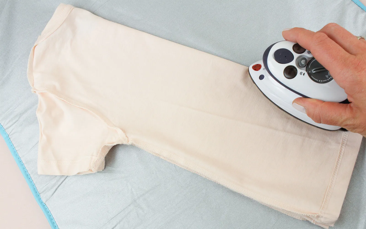 Вы когда-нибудь пробовали вышивать на маленькой футболке с помощью одноигольной бытовой вышивальной машины? Позвольте нам предложить простую пошаговую технологию, чтобы продемонстрировать, как это просто. Нам потребуются следующие материалы: Обзор технологии: Шаг 1 Закрепите стабилизатор в пяльцах вышивальной машины. Шаг 2 Используя шаблон позиционирования, отметьте центр стабилизатора в пяльцах водорастворимым маркером. Шаг 3 Отметьте расположение вышивки на футболке. Шаг 4 Выверните футболку наизнанку. Шаг 5 Сложите футболку пополам (см. изображение ниже), полностью разгладьте загнутый край утюгом. Это будет отметка для надевания футболки на пяльцы. Шаг 6 Нанесите временный клей на основу для вышивания. Будьте осторожны, чтобы избежать попадания на части машины. Шаг 7 Вывернув лицевую часть футболки наизнанку, поместите ее точно в те точки на стабилизаторе (см. изображение ниже). Шаг 8 Разверните футболку так, чтобы она закрывала стабилизатор. Шаг 9 Осторожно при