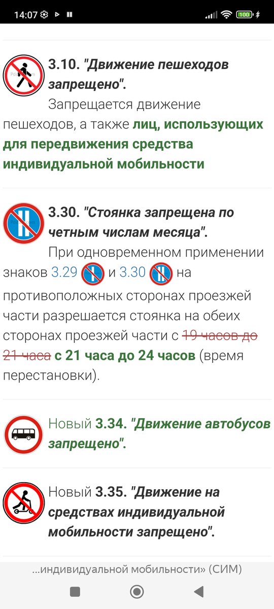 Продолжаю знакомить с изменениями в правилах дорожного движения. Разберём новые знаки. Они введены с 1 марта 2023 года. Знак 3.10 Движение пешеходов запрещено. Появилось дополнение. Распространяется на водителей управляющих СИМ. Ходить и ездить на СИМ нельзя. Если стоят знаки 3.29 и 3.30 с двух сторон, то время действия знака 3.29 Стоянка запрещена по нечётным числам месяца, действует в не чётные дни с 0 ч. 00 мин. до 21 00. Знак 3.30 Стоянка по чётным числам месяца запрещена действует в чётные дни с 0 ч.00 мин. до 21 00. С 21 00 до 0 00 знаки не действуют. Знак 3.34 является новым. Запрещает движение автобусам. На другие транспортные средства не действует. 3.35 так же является новым и запрещает движение на СИМ. На пешеходов не действует. Знак 4.5.1 Пешеходная дорожка запрещает движение механических т. с. Пешеходам и кто управляет СИМ, разрешено. Разрешается на велосипеде не создавая помех пешеходам. 5.33 Пешеходная зона так же разрешает пешеходам, и на СИМ. Разрешае