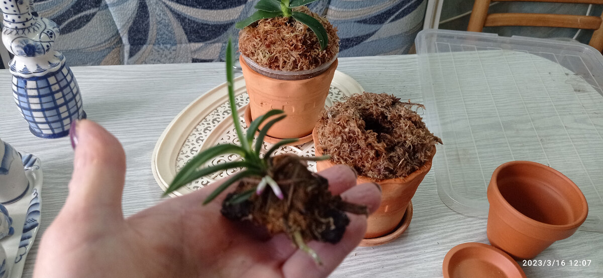 ...рукам цветовода нет покоя!! Для того и развела свой зимний садик с орхидеями, чтоб занять их, руки, зимой! Иногда и людям показать своих питомцев и затеи с ними. Редко, так сложилось, что подобрались у меня здесь садоводы, часто далеки они от капризных и сложных орхидей. Но для разнообразия, иногда можно и посмотреть! На повестке дня и на экране - орхидея неофинетия, имя ее не знаю, купила по случаю. Людей очень умилило видео с ней, хрупкий вид и яркие корни. Решила устроить ее в другой домик, что-то нет у нас в продаже неглазурованных маленьких горшков, а должны придти скоро следующие орхидеи-родственники, пусть делятся жилищем. Эту - покупала на блоке, так и разместила ее в горшок полгода назад, вот, вынула, рассмотрим посадку. Посадка будет необычная, вернее сказать , традиционная для этого рода -в моховую кочку. Придумано это японцами очень и очень давно, существует целая культура разведения, выращивания и содержания неофинетий. Специальные мастера изготавливают высокохудожеств