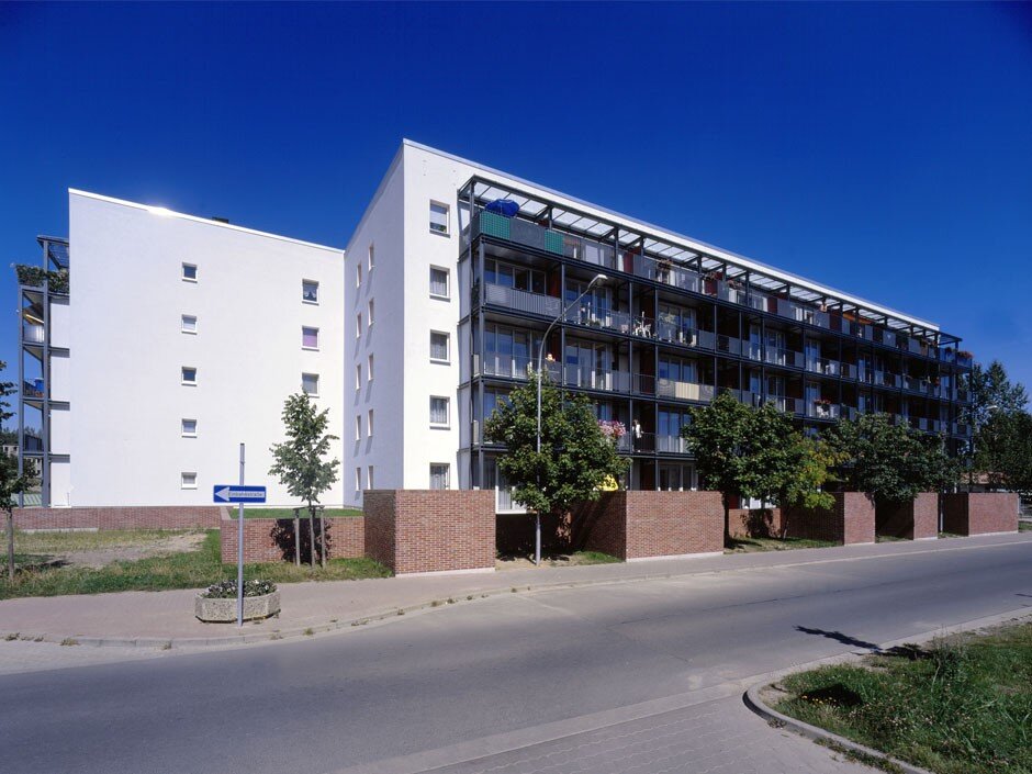 Реконструкция хрущёвок в Лайнефельде началась с двух L-образных панельных домов. Обновление коснулось 120 квартир. Кроме того, проект предусматривал сокращение количества квартир в двух зданиях на 40.