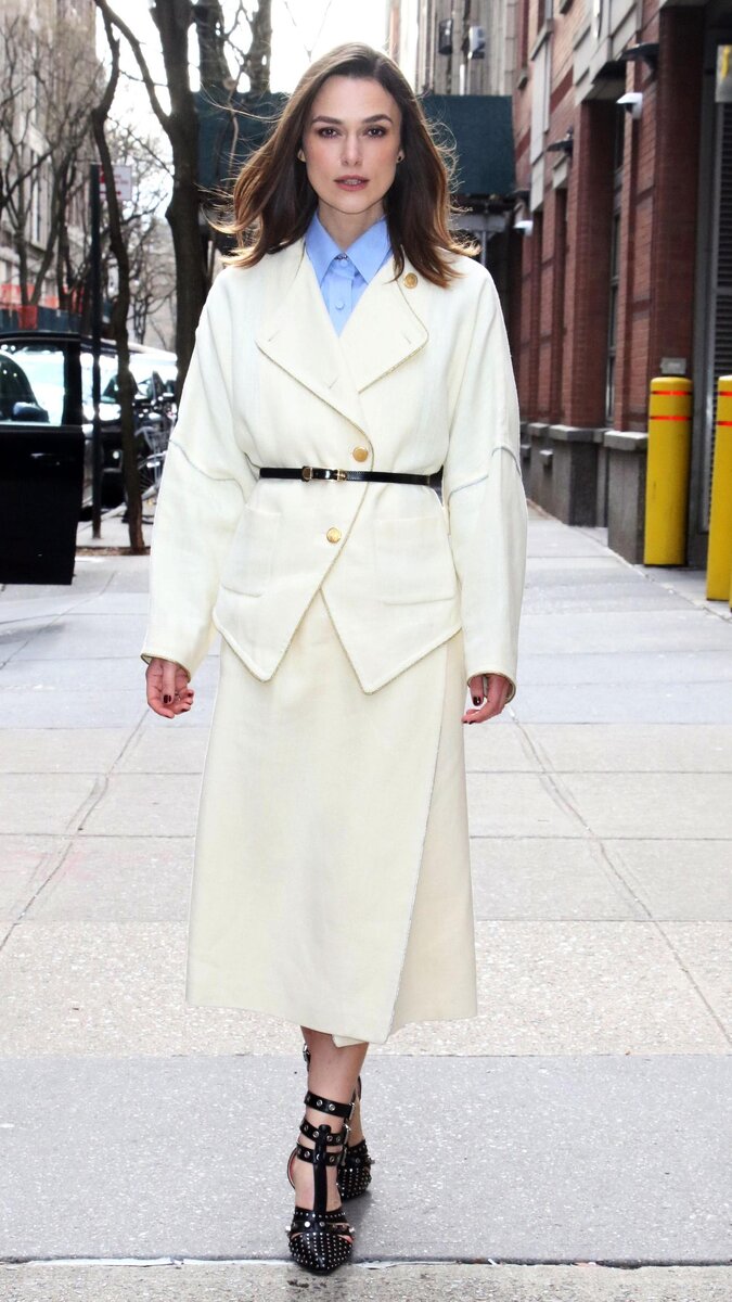 Киру Найтли нечасто встретишь в светской хронике, но в последние дни ее выходы мы будем наблюдать чаще обычного, так как девушка отправилась в промо-тур, чтобы представить кинокартину «Бостонский душитель». На улицах Нью-Йорка звезда появилась в стильном костюме. Кира Найтли надела классическую голубую рубашку, юбку с запахом и необычный жакет в молочном оттенке со спущенными плечами — его она подчеркнула лакированным акцентным ремнем. Читайте также на нашем сайте: Подписывайтесь на нас в Телеграме, чтобы быть в курсе последних новостей!