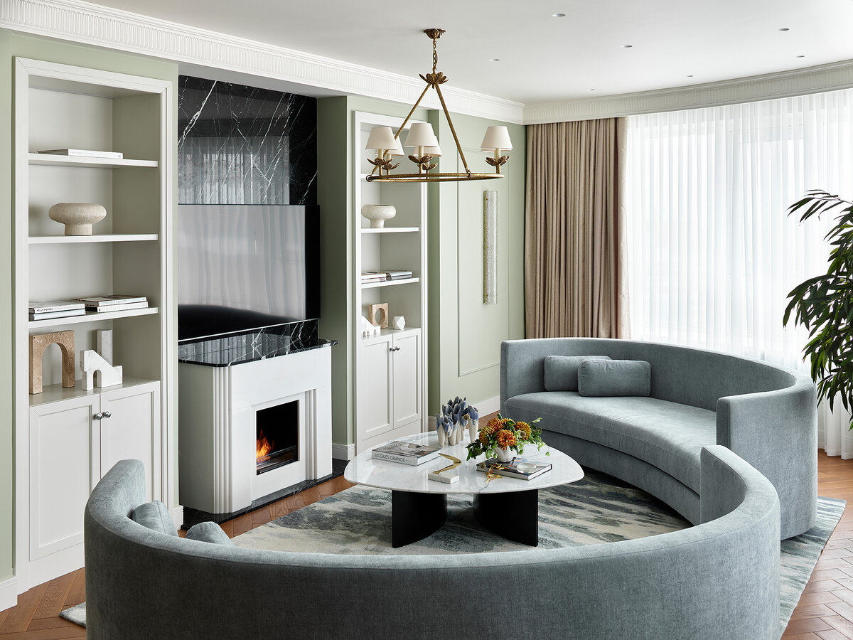 Изначально владелица квартиры хотела создать классический интерьер со сложной деталировкой гипсовых карнизов, паркетом с рисунком и другими характерными деталями этого стиля. Однако заказчик и его сын — приверженцы современной эстетики. В итоге нам пришлось искать баланс между этими двумя кардинально разными запросами. Квартира представляла собой открытое пространство с тремя несущими колоннами и обозначенными мокрыми зонами. На площади 192 кв.м мы разместили прихожую с гардеробной, гостиную, кухню, главную спальню, отдельный блок для сына с гостиной и спальней, три санузла и постирочную с лапомойкой. Поскольку предпочтения членов семьи очень разные, мы решили пойти на компромисс: в общественной части квартиры и спальне хозяйки прослеживаются классические элементы. А комната сына выполнена в более современном стиле. Тем не менее все пространства выдержаны в спокойных природных тонах и гармонично сочетаются друг с другом. В гостиной и кухне стены выкрашены в оливковый оттенок, на фоне