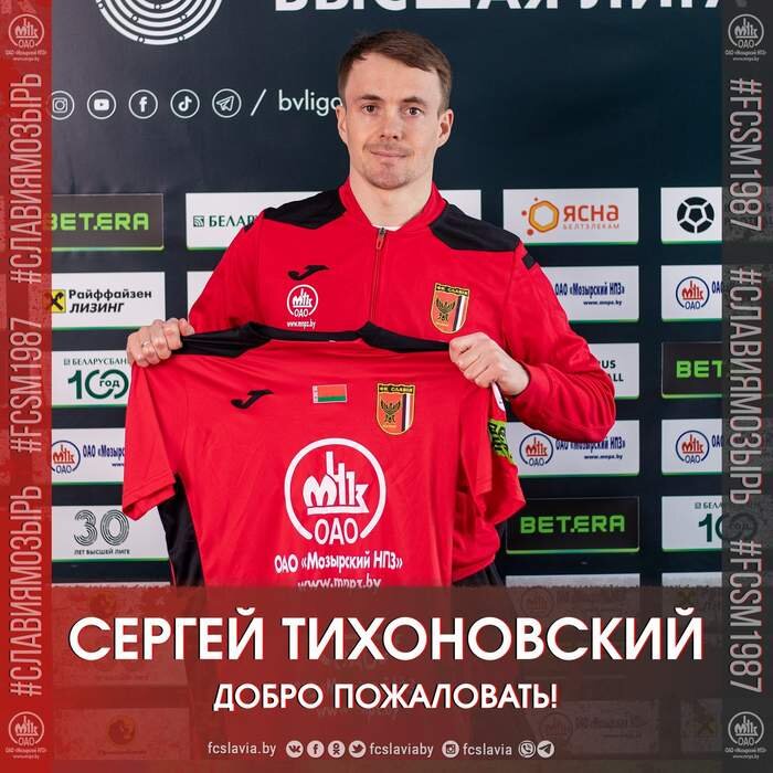 Полузащитник Сергей Тихоновский вернулся в мозырскую "Славию". На pressball.by стартует новый сезон конкурса прогнозов "ПБ-Тото"! "Родился 26 июня 1990 года (32 года) в Смолевичском районе, Минской области. Начинал карьеру в составе дубля БАТЭ, откуда в 2010 году перешел в "Руденск". В 2011 году стал игроком жодинского клуба "Торпедо"-БелАЗ, вместе с которым дебютировал в высшей лиге. В феврале 2013 года покинул клуб. Сезон-2013 провел в первой лиге в клубе "Береза"-2010. С марта по октябрь 2014 года был игроком могилевского "Днепра". С января 2015 года находился в составе нашего клуба. В марте подписал контракт. Был основным опорным полузащитником в составе "красно-черных". В феврале 2016-го отправился в стан "Витебска" и вскоре подписал контракт. В начале 2018 года готовился к новому сезону с "Витебском", однако в феврале покинул команду и присоединился к таджикскому клубу "Истиклол". В первом же матче выиграл Суперкубок Таджикистана. В июле 2018 года стал игроком "Городеи". В ноябре