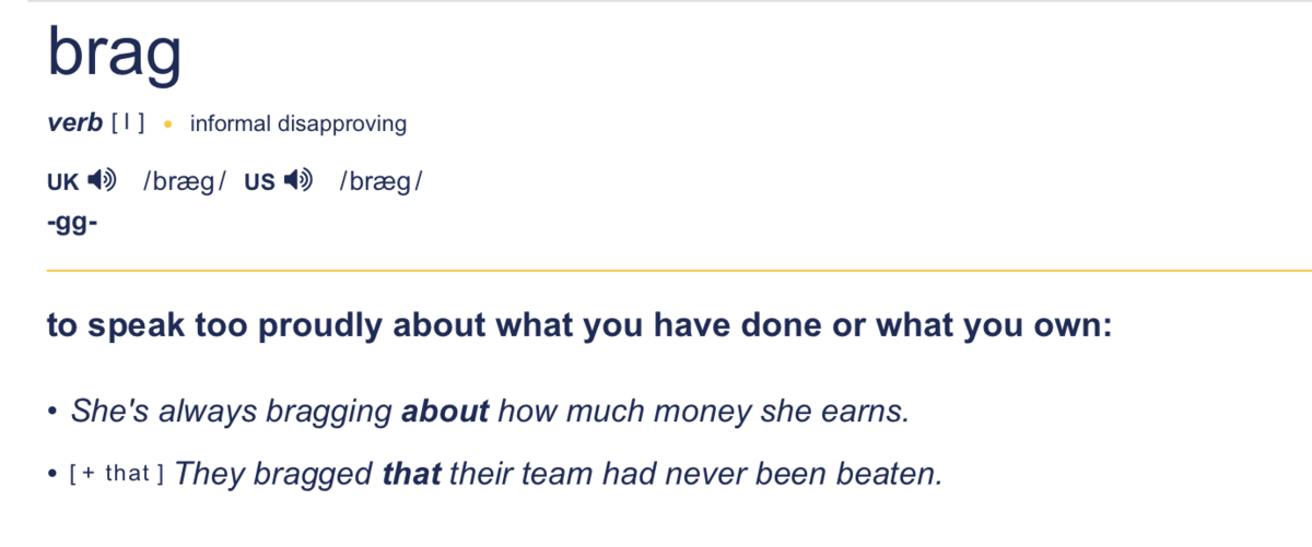 "Brag" обычно означает, что кто-то излишне хвалит свои достижения и вещи, стараясь произвести впечатление на других. Это своего рода самовозвеличивание, при котором такое хвастовство не всегда подкреплено реальными достижениями. Человек пытается казаться важнее, значительнее, чем он есть на самом деле. Обычно это носит негативный оттенок и может восприниматься как грубость.