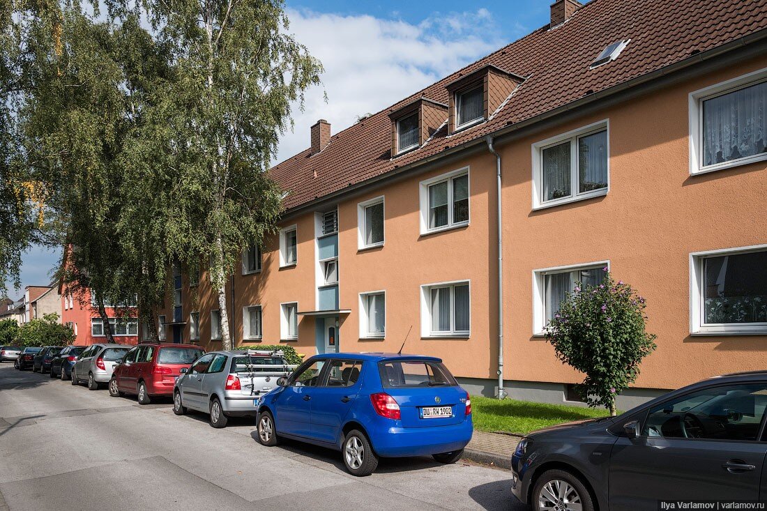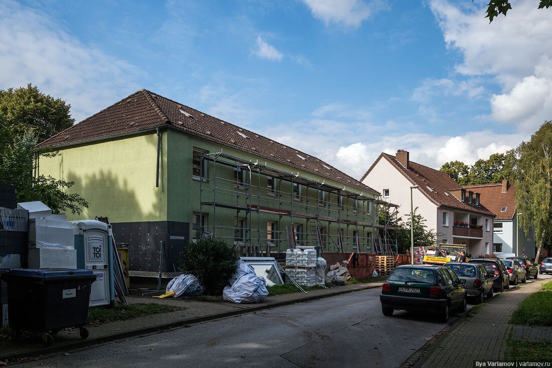 Я уже рассказывал вам, как в Германии проводят реновацию устаревших жилых домов. Иногда дом довольно радикально перестраивают: убирают или надстраивают этажи, "вырезают" целые подъезды. В Дуйсбурге подход к реновации более мягкий. После войны там активно велось массовое жилищное строительство, поскольку многие горожане остались без крова из-за бомбардировок. Сейчас послевоенные дома уже устарели и требуют каких-то действий со стороны владельцев. Осторожно, сейчас любители российского жилищного тюнинга получат большую дозу эстетического наслаждения! 01. Обычный двухэтажный дом. Он в хорошем состоянии, не разваливается, но морально устарел. Такая недвижимость теряет ликвидность, и немцы затеяли РЕНОВАЦИЮ! 02. Что же с ними делают? Ставят леса... и что-то монтируют. 03. На фасаде появляются какие-то крепления... Зачем? 04. Роют фундамент... Что они задумали? 05. Ого! 06. Да! Они пристраивают балконы! То, что любят делать у нас на юге, только в Германии это всё красиво, аккуратно, а главн