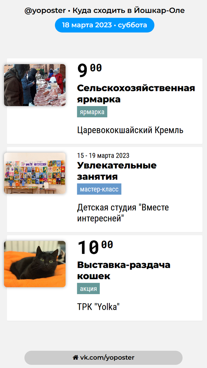 Субботний день в Йошкар-Оле можно провести насыщенно и постараться посетить несколько мероприятий: открыть для себя новое увлечение, попасть на лекцию, а вечером послушать живую музыку или увидеть шоу. Выбирайте!