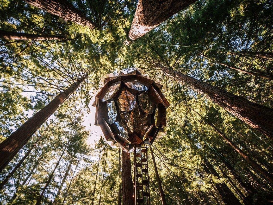 Сегодня мы расскажем вам про одно очень необычное, а самое главное красивое строение, под названием домик-шишка.Именно природа вдохновила архитектора Дастина Файдера, для того чтобы он построил на дереве этот необычный домик. Дом был спроектирован в форме шишки, и из-за этого он стал уникальным.Чешуйки здесь выступают в роли защитных экранов для панорамных окон. Эти чешуйки везде, и на потолке, и на полу, и конечно же на стенах. И несмотря на то, что площадь домика небольшая, в нем поместилось всё то, благодаря чему можно без проблем созерцать всю красоту леса. На первый взгляд, кажется, что домик на дереве парит в ветвях деревьев, погружая вас в 360-градусный вид на лес Рэд Вуд. Ведь прозрачный пол, стены и потолочные панели позволяют видеть всё вокруг и создают волшебную иллюзию левитации. Этот захватывающий дух домик-шишка находится на высоте более десяти метров над землей, и единственный способ добраться туда, это крутая лестница. Поэтому те люди которые боятся высоты не посещают э