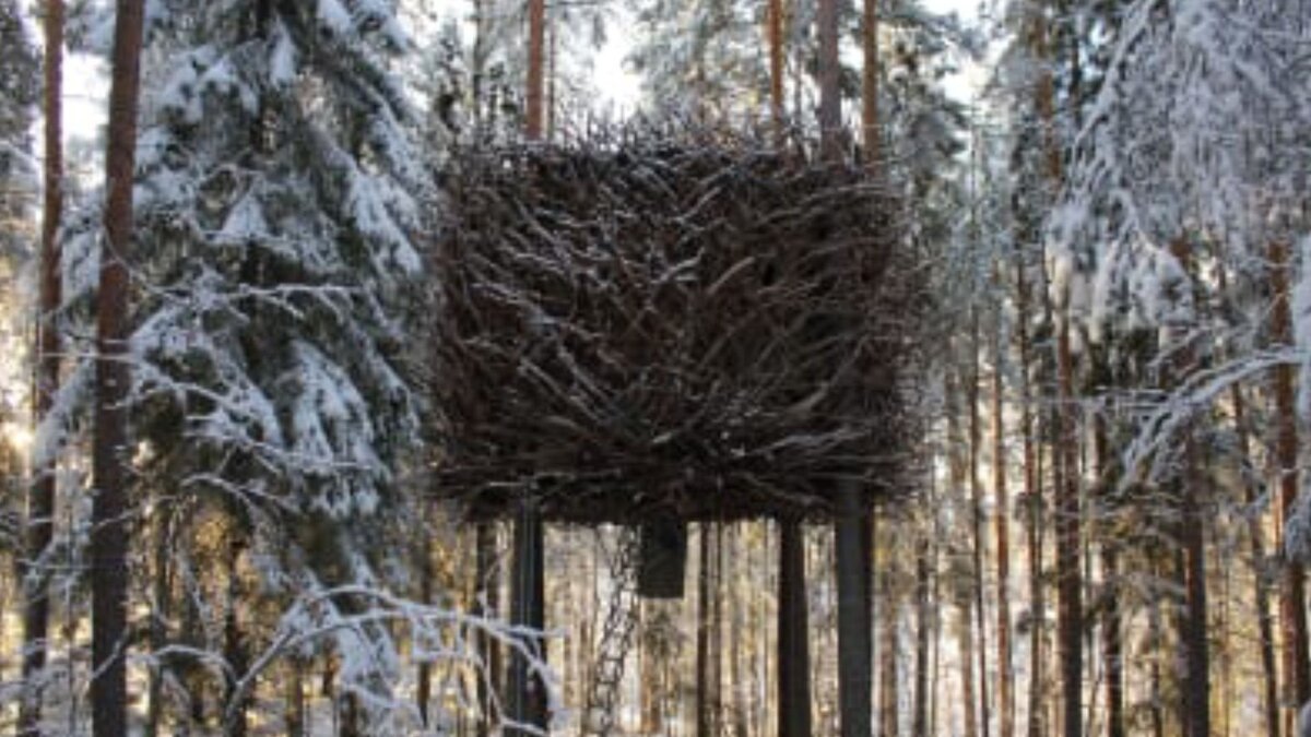 Сегодня мы расскажем вам про очень интересное и своего рода уникальное строение, которое находится на дереве. Птичье гнездо, как следует из его названия, выглядит как гигантская птица, замаскированная среди деревьев леса Харадса. Стены обшиты деревянными панелями, а окна почти исчезают в сети ответвлений снаружи. Выдвижная лестница обеспечивает доступ к гнезду. Вы попадаете в гнездо именно по выдвижной лестнице, и в этом строении может разместиться семья из четырех человек. Стены сделаны из светлых деревянных панелей, а в окнах есть иллюминаторы. Интерьер птичьего гнезда представляет собой современный и эксклюзивное помещение площадью 17 квадратных метров со спальнями, туалетами и гостиной, а душевые находятся в соседнем здании. Строение птичье гнездо предлагает просторную среду, где может комфортно расположиться семья с двумя детьми. Вокруг находится красивый лес, и соответственно очень чистый воздух. Зимой в доме находится очень комфортно, так как внутри он теплый и уютный. На самом
