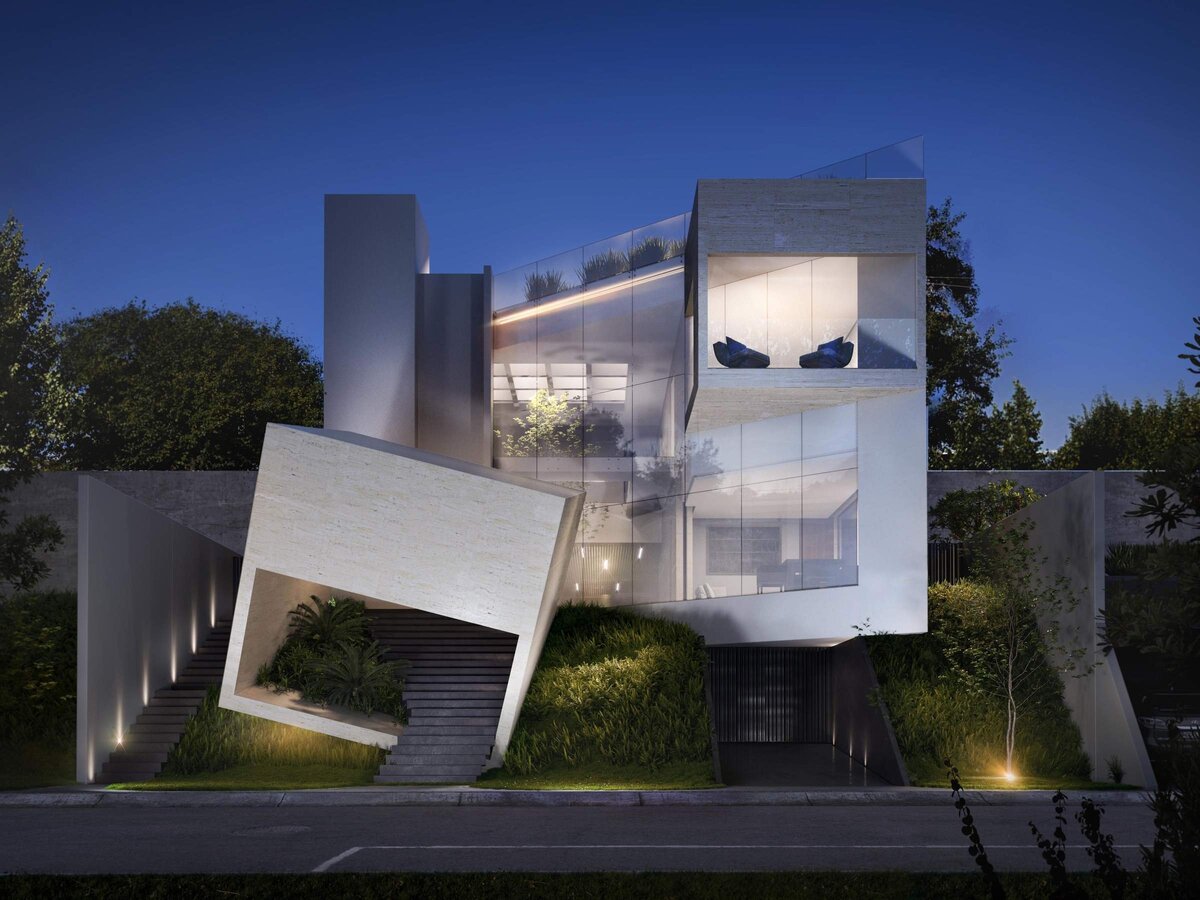 Сегодня мы расскажем вам про необычный по своей форме дом который находится в частном заповеднике Мексики. Этот дом построен для одной молодой пары, один куб дома представляет её, а второй его. В соответствии с профессией хозяина дома, куб показан немного повернутым и брошенным вперед, что символизирует мужество, отвагу и способность контролировать риск, необходимые для его повседневной работы. В этом уникальном строении находится полуподвальный гараж на пять автомобилей, подсобное помещение, мини-кухню и прачечную. Также есть зона с лифтом и кинотеатр на 12 человек с кладовой и баром. На первом этаже, на который можно подняться либо на лифте из полуподвала, либо через вращающийся куб, находится кабинет, двойная галерея и лестница ведущая на второй этаж. Через первый этаж можно попасть в общественные зоны столовой, кухни, игровой комнаты и сада. На кухне есть большая кладовая и остров больших размеров, а также служебная лестница, ведущая из подвала на люк через первый этаж и верхний эт