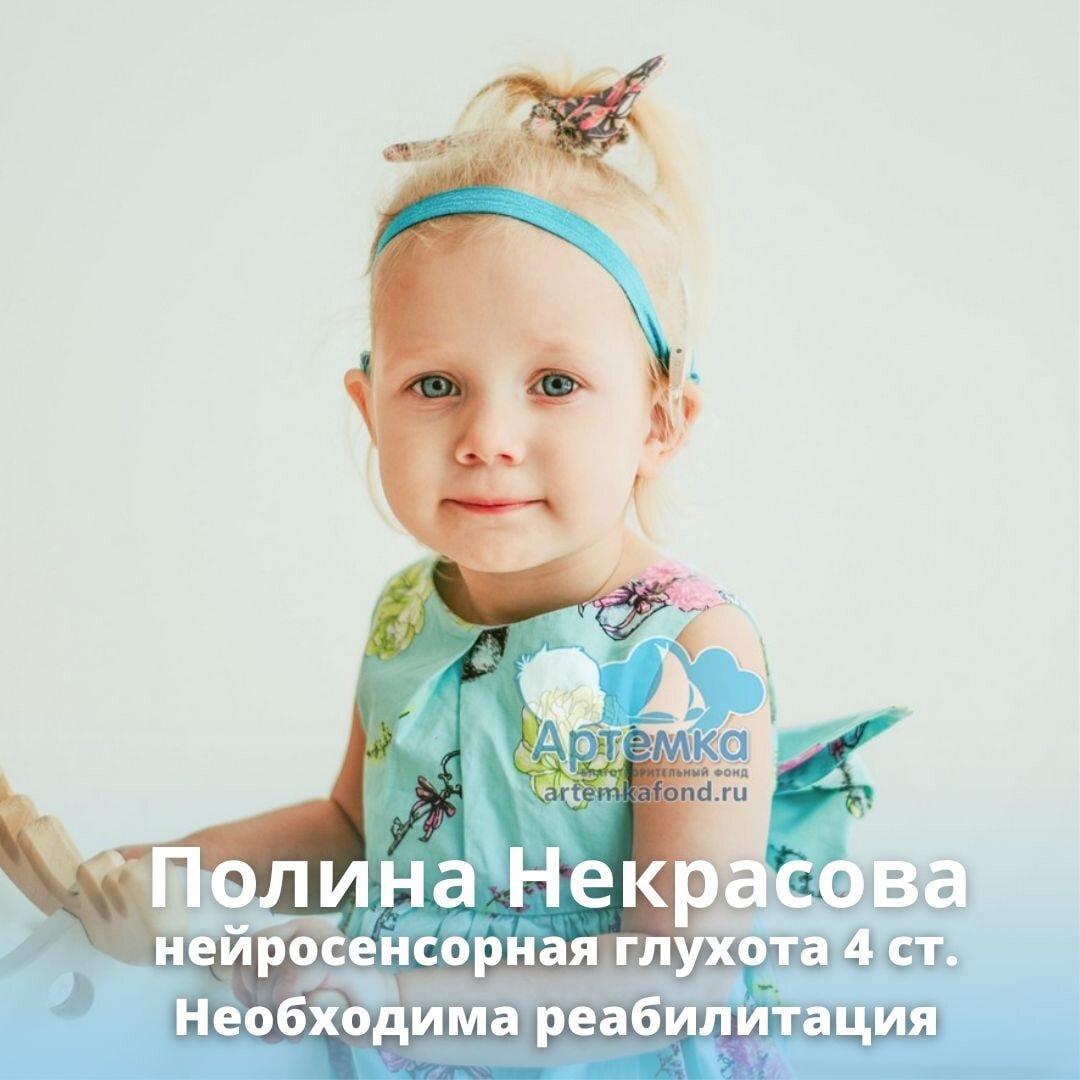 Поляшка - маленькая улыбашка, которая радуется всему, а слезы льет буквально считанные минуты. От любой затеи и любого танцевального па сестры нужно отсчитать 5 секунд и можно любоваться им в Полином исполнении. А ещё у Полины нейросенсорная глухота 4 ст. В год Полине сделали операцию кохлеарной имплантации и она услышала звуки через электронное ушко. И начался новый этап освоения мира звуков, который дается не так быстро и легко морально и физически, как хотелось бы. Помочь: ссылка Помочь: ссылка В 2 года Поляшка начинает радовать родителей новыми словами и словарный запас переходит за 80 слов. 80 слов словно рубеж к долгожданной речи, вера, надежда и любовь в электронный слух дочери. Для новых успехов Поле нужна реабилитация в специализированном центре. Полина нравится все интересное и ее огорчает, что в художественный кружок сестру взяли, а ее нет. Что сестра может выступать на сцене красивым котенком, а Поля только громко хлопает в ладоши и любуется из зрительного зала, ведь стихот