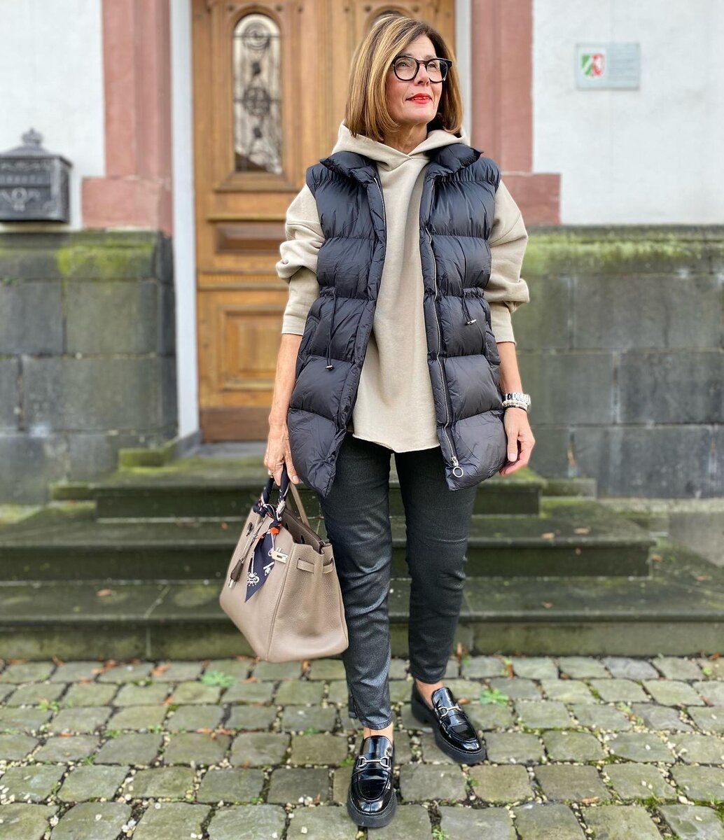 Дамам «за 50» не стоит отказываться от кожаной одежды. Так, кожанку можно комбинировать с брюками, свитерами, водолазками, толстовками, а также с женственными платьями, юбками.
