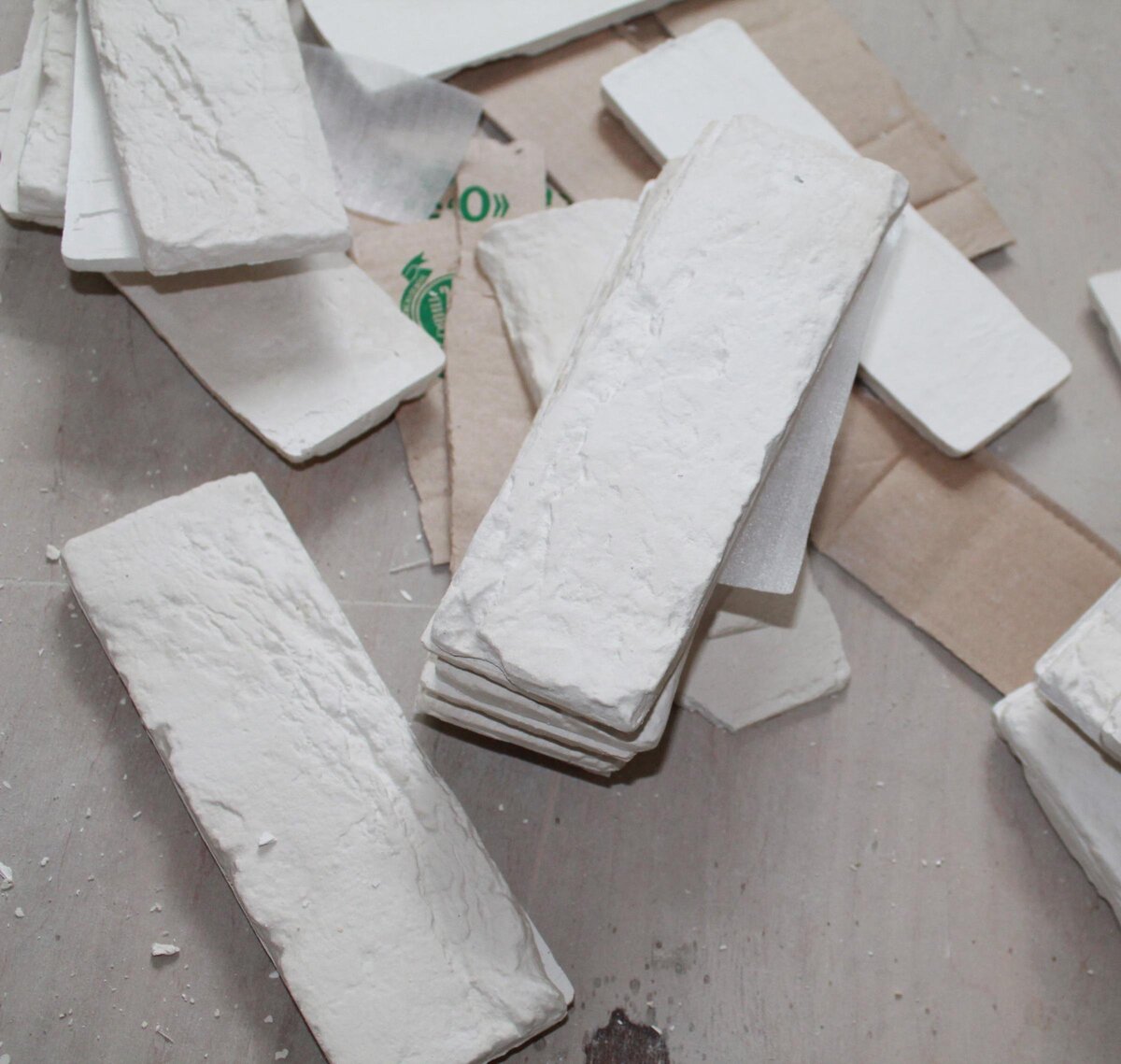 Добрый день. Не так давно стали осваивать технологию изготовления маленьких гипсовых плиточек, которые при наклеивании на стену имитируют настоящий кирпич, создавая эффект кирпичной стены. Работа, что называется, не пыльная. О том, как все начиналось можете просмотреть на нашем канале. Радость была недолгой. После упаковки готовых высушенных кирпичей в коробки через пару дней с удивлением обнаружили там конденсат. Ну или что-то вроде конденсата. Сама коробка была прилично промокшей. На каком этапе пошло не так, не знаем. Готовые кирпичи сушили примерно 48 часов с момента извлечения из формы. После чего аккуратно сложили в картонные коробки в 2 ряда. Тыльная сторона к тыльной стороне, а между парами кирпичей проложили прокладку. Возможно этого делать не нужно, но я боялся, что в ходе хранения кирпичи могут друг другу навредить (расколоться) Возможно готовые кирпичи недостаточно хорошо просушили. И в тесной коробке они с удовольствием отдали лишнюю воду картону. Так или иначе, но ситуаци