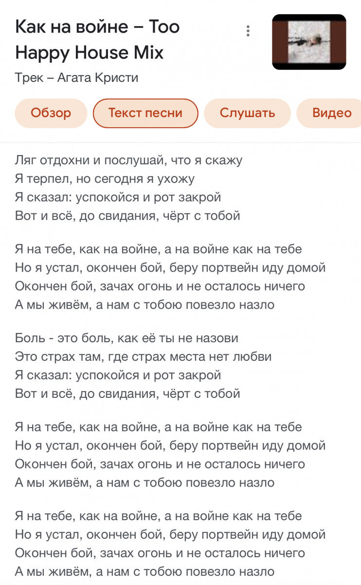 Я не первый раз слышала песню Агаты Кристи «Я на тебе, как на войне», но после развода и психологического образования увидела в этих знаменитых словах огромный смысл. Точное описание зависимости, созависимости и треугольника Карпмана. Сейчас опишу подробно. Будет описание со стороны психологии и отношений с мужчиной-алкоголиком. «Я сказал: успокойся и рот закрой Вот и все, до свидания, черт с тобой.» Мужчина в грубой форме просит перестать говорить свою женщину. Можно предположить, что она кричит, произносит неприятные для него слова. Женщина скорее всего созависимая, ведет себя очень эмоционально, подключается к состоянию мужчины, возможно, закатила истерику и герой песни в грубой форме говорит ей замолчать. Говорит, чтобы она ушла «до свидания, черт с тобой»- относительно мягкое выражение в реальной жизни больше нецензурной брани, очень похоже на манипуляцию. «Я на тебе как на войне, а на войне, как на тебе, Но я устал окончен бой, беру портвейн иду домой.» Их страстные отношения, ка
