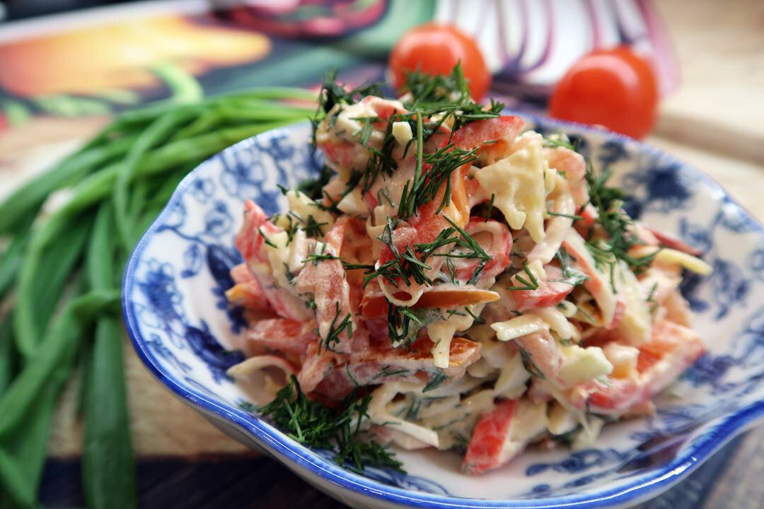 Для тех, кто любит краткие рецепты Ингредиенты: Помидоры – 2 шт. Крабовые палочки – 200 г Болгарский перец – 1 шт. Яйца – 2 шт. Сыр – 120 г Чеснок – 2 зубчика Укроп – небольшой пучок Майонез – 100 г Соль, перец – по вкусу 1. Крабовые палочки нарезаем небольшими кусочками, разрезая каждую палочку поперек и немного наискосок. 2. Помидоры промываем, обсушиваем и разрезаем пополам. Если помидоры у вас сочные, как у меня, то лучше удалить мякоть и взять только твердую часть. Нарезаем помидоры соломкой. 3. У перца удаляем семена и перегородки. Нарезаем перец соломкой. 4. Яйца отвариваем, охлаждаем, чистим и нарезаем кубиками или соломкой. 5. Сыр натираем на крупной терке. 6. Зелень промываем, обсушиваем и мелко нарезаем. 7. Чеснок мелко нарезаем. 8. В салатнике смешиваем все ингредиенты. 9. Солим, перчим по вкусу и заправляем майонезом. Все тщательно перемешиваем. Для тех, кто любит подробные рецепты с картинками Для тех, кто любит видео рецепты А какие вкусные салаты с крабовыми палочками