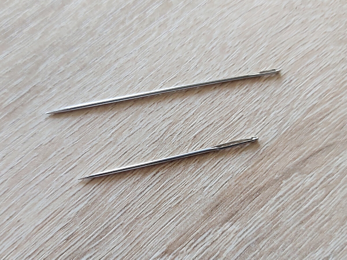 Вот для сравнения две иглы: штопальная и гобеленовая, сразу понятно, что гобеленовая игла для наборных швов не подходит - короткая, ушко слишком широкое. Навивы делаем на середине иглы, и протаскивать ушко через навивы будет трудно, так как оно более широкое, кроме того, игла короткая, много навивов на ней не сделать!