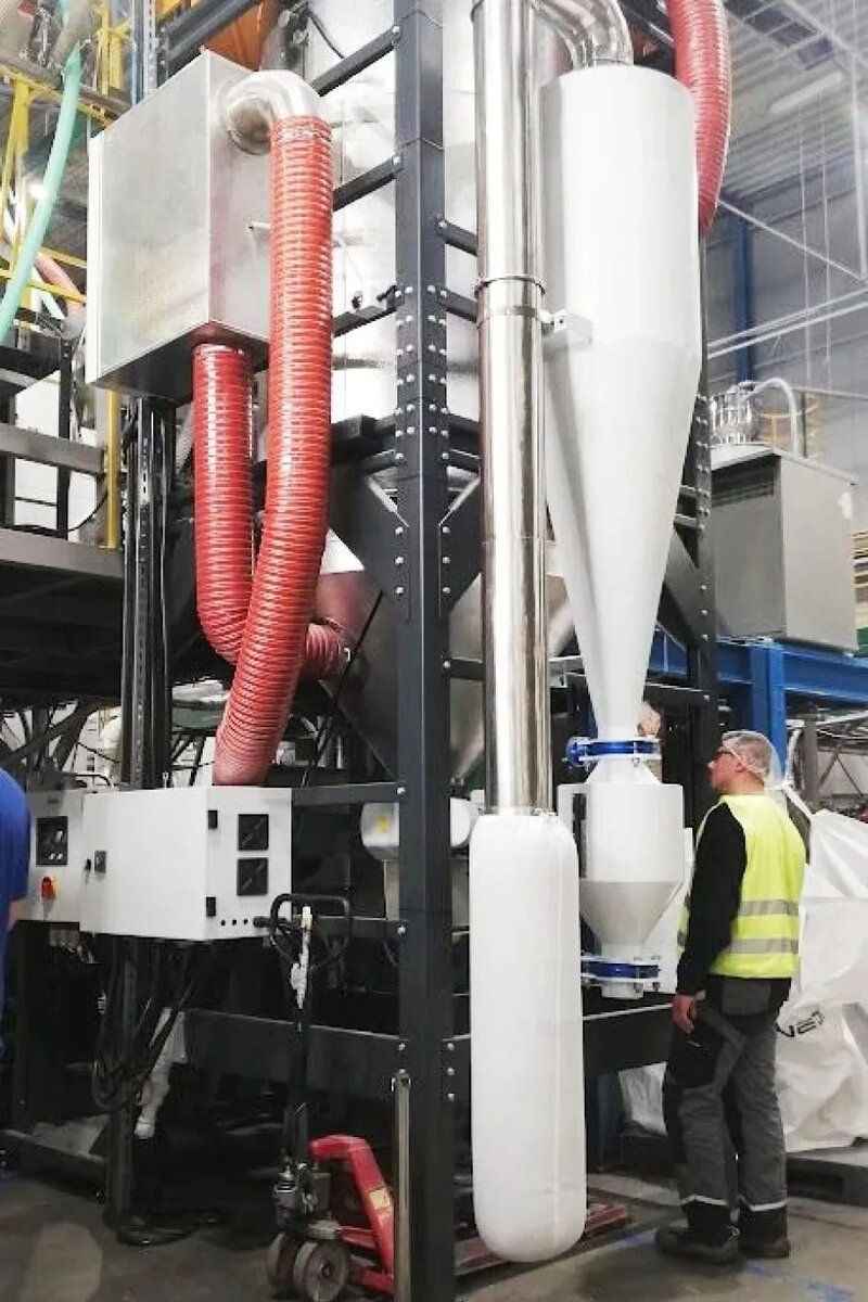 Недавно компания SHINI-EUROPE запустила на производственной площадке одного из своих клиентов высокопроизводительную систему переработки ПЭТ- флексы. Данная система представляет собой комплекс периферийного оборудования, позволяющего осуществить все этапы процесса предварительной подготовки ПЭТ. Переработанный материал используется для производства ПЭТ-пленки которая в дальнейшем применяется для упаковки пищевых продуктов. Комплекс для переработки ПЭТ включает в себя гравиметрический (весовой) дозатор SGB, конвейер положительного давления SRPC, циклонный сепаратор ACF, кристаллизатора ПЭТ SCR, вакуумный загрузчик SAL-UG, осушитель SD-H и сушильный бункер DH-U. Гравиметрический дозатор-смеситель SGB в автоматическом режиме подает ПЭТ гранулы и флексу, что очень важно для гарантированной точности и стабильности пропорции переработанных материалов. Смесь ПЭТ транспортируется с помощью конвейера положительного давления SRPC в кристаллизатор ПЭТ SCR-2500U, где происходит процесс кристаллиза