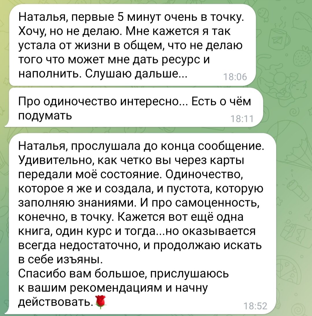 Обратную связь я получила после первого прослушивания расклада. Но желательно прослушать трактовку не менее 3х раз. Первые два раза с интервалом в сутки. И третий раз - через несколько дней.
