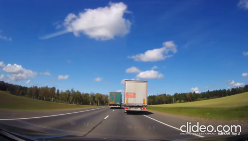 На фото: все та же разноцветная фура пошла на обгон уже другого белого фургона (скриншот с видео от 27.07.2022 г.)