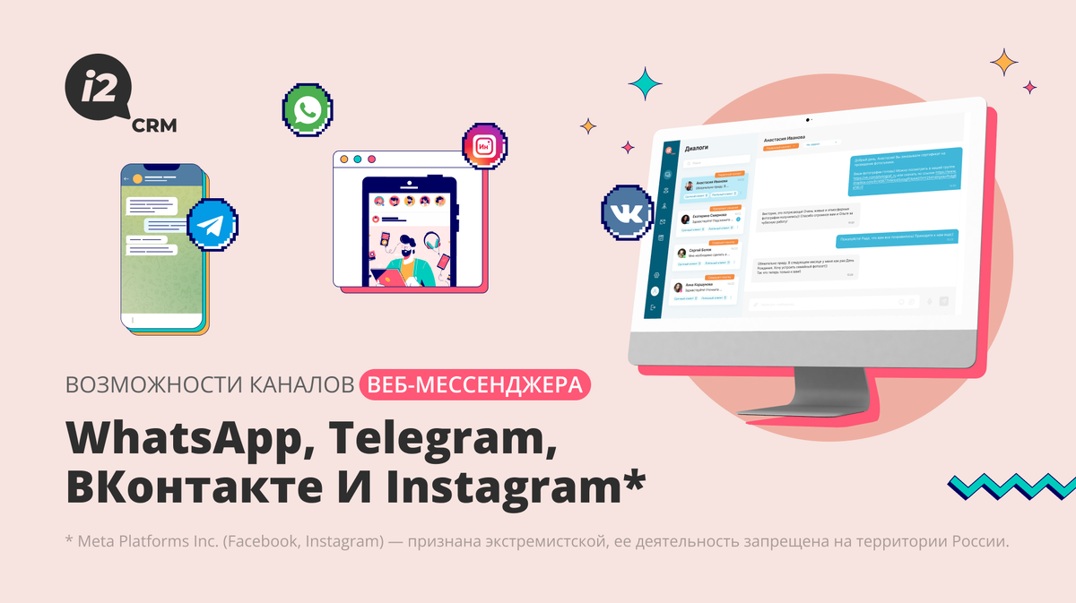 Веб-мессенджер — альтернативный CRM-системе онлайн-сервис, который переводит комментарии и сообщения из WhatsApp, Telegram, ВКонтакте и Instagram* в одно окно браузера. Он доступнее и проще в работе, и по возможностям легко заменит CRM-систему небольшому бизнесу, который продает через соцсети и мессенджеры. Подключайте каналы и пользуйтесь привычными опциями, но через Веб-мессенджер: 🟠 в WhatsApp: обменивайтесь любыми сообщениями — текст, эмоджи, GIF, аудио, ссылки, фото и видео с подписью, документы. Подключайте канал через мульти-девайс — это возможность одновременной работы приложения с четырех разных устройств. Так вы останетесь на связи, даже если какое-то из них потеряет доступ к сети или разрядится; 🟠 в Telegram: переписывайтесь с клиентами в удобном формате — отправляйте текст или голосовые сообщения, прикрепляйте фотографии товаров, гайды, сертификаты и видео; 🟠 во ВКонтакте: отвечайте на личные сообщения, комментарии к постам и видео и отправляйте реакции на сторис в одном