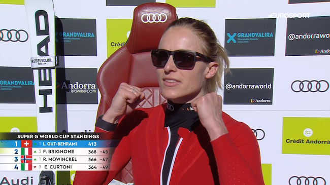 Швейцарская горнолыжница Лара Гут-Бехрами в очередной раз подтвердила свой статус одной из лучших спортсменок мира. Сегодня в Сольдеу она одержала победу в финале и выиграла "Малый хрустальный глобус" в супергиганте. Перед гонкой пять спортсменок претендовали на Кубок мира в супергиганте – пятое место от первого отделяли всего 44 очка. Итальянка Федерика Бриньоне провела отличную гонку, но в итоге ее результат оказался недостаточным для того, чтобы занять первое место и забрать кубок. Рагнхильд Мовинкель не смогла опередить итальянку и уступила ей 25 сотых, выбыв из борьбы за "глобус". Лара Гут-Бехрами лидировала на протяжении всей трассы, несмотря на то, что стартовала позже Бриньоне. Она опередила свою соперницу на 22 сотых секунды, и девушкам оставалась только ждать финиша других соперниц. В итоге ни Конни Хюттер, ни Елена Куртони, лидировавшая в зачете супергиганта до начала гонки, не смогли обойти Лару, Федерику и Рагхильд. Благодаря победе в заключительной гонке