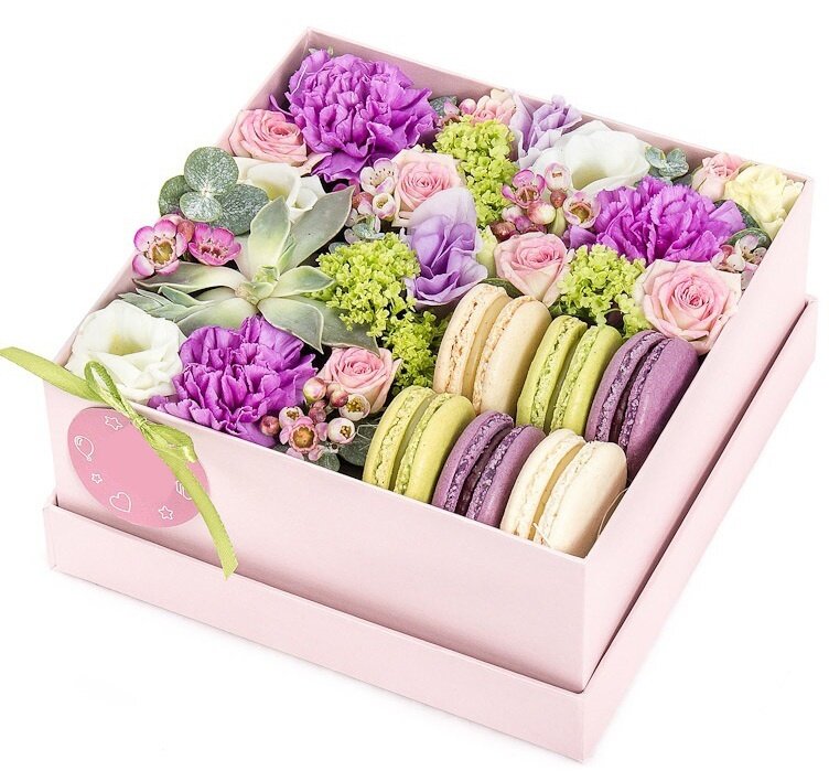 Подарок будет вдвойне очаровательным, если вы проявите фантазию. Предлагаем купить букет из макарунов в Гродно от нашего интернет-магазина. Подобные презенты пользуются популярностью уже несколько лет. Во всем мире такими наборами радуют любимых женщин, матерей, сестер. Попробуйте хотя бы раз вместо традиционного букета цветов преподнести близкому человеку коробочку с сюрпризом. Учитесь удивлять вместе с нами! Что такое букет из макарунов В красивую и стильную коробку — обычно круглую или в форме сердца — кладут живые цветы. А во второе отделение бережно укладывают сладкое лакомство. В итоге получается красочный и ароматный микс, который обязательно заставит сердце девушки биться быстрее. Макаруны — это сладости, родившиеся в результате экспериментов французских кондитеров. Их выпекают из миндальной муки, а затем добавляют ваниль, шоколад или ягоды. Любительницы сладкого обязательно оценят такой нестандартный подарок. Каждый контейнер имеет крышку, чтобы сладости смогли доехать до адре
