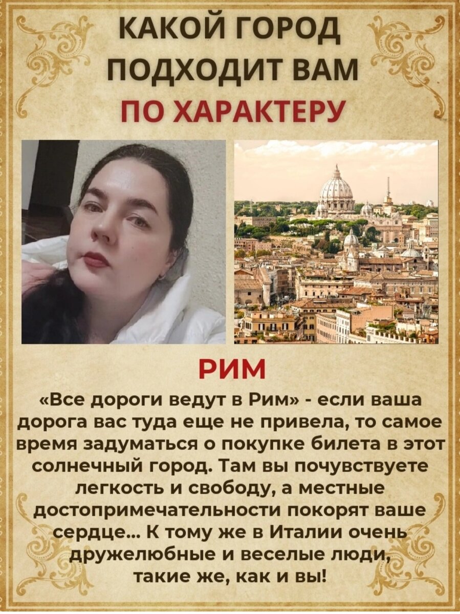 Тесты. Очень нравятся мне тесты в ВК, времени много не отнимают, а после прохождения выдают замечательную картинку. К сожалению точно таких же на просторе интернета я не нашла, но нашла аналогичный то же не плохой тест. Кто из вас зарегистрирован в ВК оставляю ссылку для прохождения теста: Но, а остальным предлагаю пройти вот этот не менее интересный тест и узнать, какой город подходит вам по вашему характеру и мировоззрению: Кстати вопросы очень похожи в тестах, проходите любой из них и делитесь результатами в комментариях. А если тесты пришлись вам по душе', то не забудьте поставить лайк 👍 статье, буду рада😊🤗