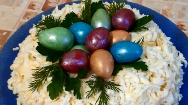 Рецепт вкусного праздничного салата Пасхальное гнездо с перепелиными яйцами
