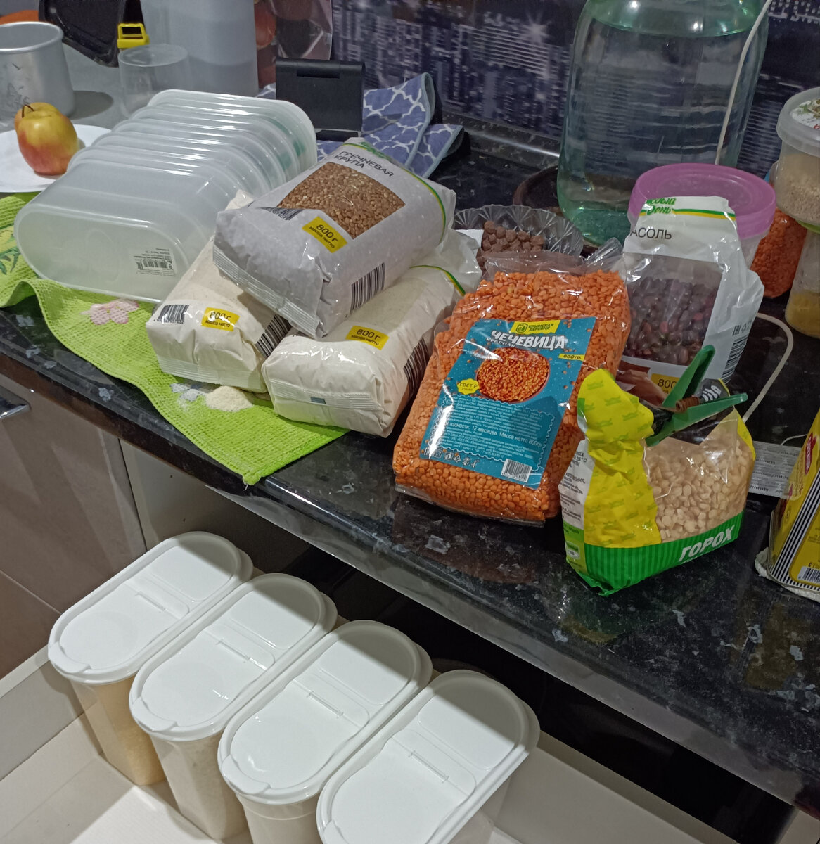 Приветствую вас, друзья 🙌😉 Вы на канале 🏡Домик в Крыму, сегодня я вам расскажу как я пыталась организовать и вымыть кухню😉. Наконец я дождалась маленькие контейнеры для сыпучих, поэтому занялась организацией хранения круп. Крупы заняли целый ящик и мне это не очень нравится, эту полезную площадь я бы лучше заполнила посудой. Обдумываю перемещение круп в кладовую. Я думаю особого труда не составит пойти и взять контейнер с крупой оттуда. Навесной шкаф абсолютно не освободился и мне это не нравится. Понимаю одно - требуется полное расхламление. Очень много подарочных баночек с разными ароматными чаями, некоторые я ссыпала в одну банку, думаю, никто и не заметит, но глобально это не исправило ситуацию. Продолжила организацию этого шкафа, но ещё буду думать, что можно с ним сделать. Пока сюда переместила всё, что не поместилось в другом месте. Пока муж командовал на кухне, шкаф за плитой еле закрывался, сюда впихнули даже хлеб🙈😭 Конечно, я не смогла на это смотреть спокойно и бы