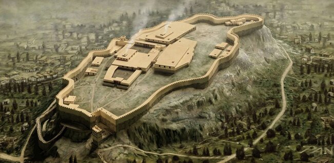 В период, так называемой, микенской культуры, во втором тысячелетии до н. э., здесь была возведена крепость. По преданию, построил её пришедший из Египта правитель Кекроп. Эта крепость, следы которой сохранились по сегодняшний день, была сооружена из тщательно подобранных и подогнанных друг к другу, в форме неправильных многоугольников, камней, не скрепленных каким-либо раствором.