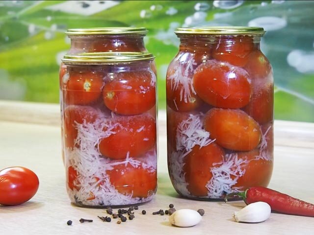 На 2(1,5 литровых) банки. Стерилизуем банки. -Укладываем помидоры в 2 банки(по 1,5 л). -Заливаем кипятком,оставляем на 15-20 мин. А пока займемся маринадом.