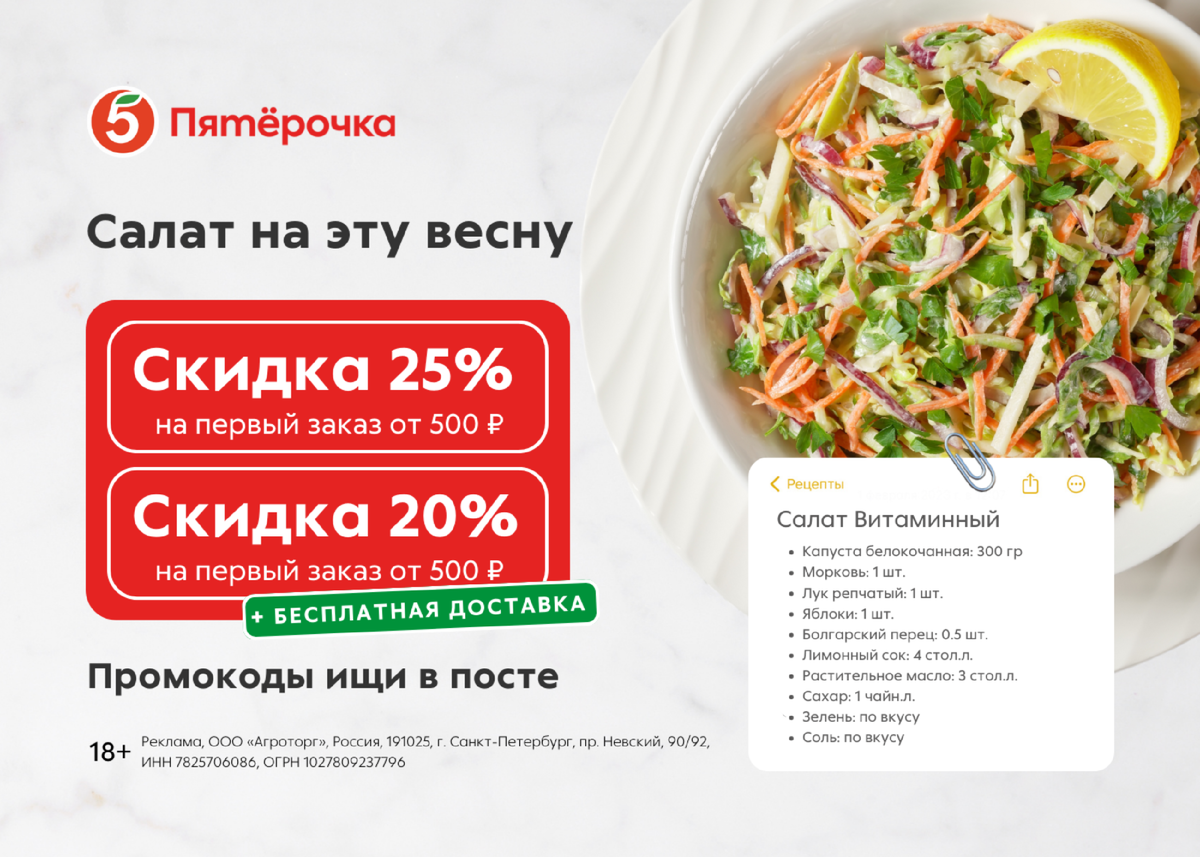 "Экономьте с Пятёрочкой" - Промокод на скидку на первый заказ: ssxj7fxd - скидка 20 % + бесплатная доставка на первый заказ от 500₽.