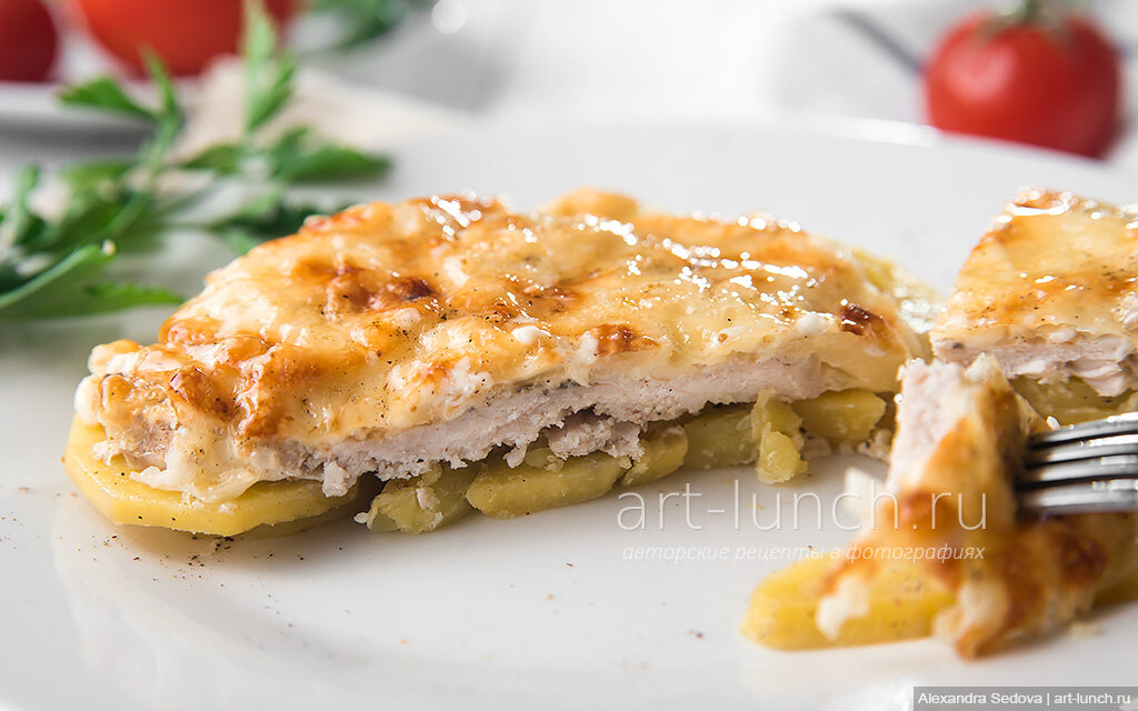 Ингредиенты свинина - 500 грамм картофель - 500 грамм томат - 1 штука лук - 1 штука сыр - 300 грамм майонез - по вкусу Шаг 1 порежьте свинину на тонкие ломтики. Лучше всего резать вдоль, отбейте мясо молотком с двух сторон. Натрите мясо солью и специями, можно добавить сушоную зелень (по вкусу) Шаг 2 порежьте лук пополам а затем тонкими полукольцами, томаты вымайте порежьте их средними по толщине кружочками. Шаг 3 разогрейте духовку до 180 градусов. Противень смажьте растительных маслом , выложите на противень картофель в плотную друг дружки немного посолите его. Если мясо достаточно соленое, солить картофель не стоит. Шаг 4 на картофель выложите порезанный кольцами томат. На томат выкладывайте лук а затем мясо. Протрите сыр твердый на крупной тёрке) мясо смажьте майонезом а сверху посыпьте тёртым сыром. Запекайте примерно 30 - 40 минут. Приятного аппетита.