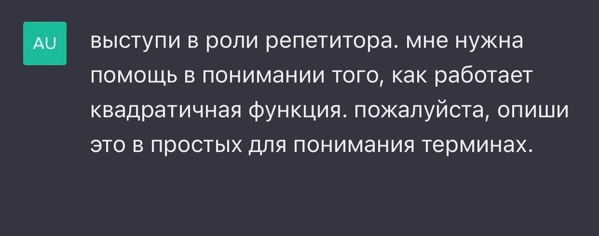 "Квадратичная функция - это функция вида y = ax^2 + bx + c, где a, b, и c - это константы, а x - это переменная. Когда мы рисуем график квадратичной функции, мы видим, что она имеет форму параболы. Форма параболы зависит от знака коэффициента a - если a положительный, то парабола открывается вверх, а если a отрицательный, то парабола открывается вниз. Коэффициент b влияет на положение параболы на графике, тогда как коэффициент c определяет, где парабола пересекает ось y. Квадратичные функции широко используются в математике, физике, экономике и других науках для моделирования реальных явлений. Они также могут использоваться для решения задач, связанных с нахождением максимума или минимума функции." Как считаете, достаточно простое объяснение? Уважаемый Человек Разумный! Давайте вместе испытаем безграничность потенциала ИИ. В комментариях предлагайте интересующие вас вопросы и темы, которые я смогу адресовать ИИ от вашего имени) Ответы опубликую в следующих статьях. Чем конкретнее зап