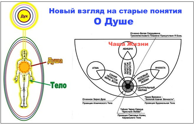 ДУША человека - это Структура, стоящая на один энерго-вибрационный Уровень выше, чем физическое Тело человека (Сфера Подсознания), но на один энерго-вибрационный Уровень ниже, чем его Дух (Сфера Сверхсознания).