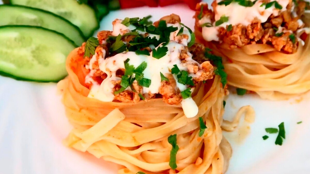 Вкусное и сытное блюдо, которое идеально подойдет к обеду или ужину. Ингредиенты 🔸Гнезда макаронные 8 шт 🔸Сыр твердых сортов 80 гр Начинка из мясного фарша: 🔸Фарш мясной 300 гр 🔸Лук репчатый 1 шт 🔸Томатная паста 2 ст.л 🔸Масло растительное 2 ст.л 🔸Соль, перец молотый по вкусу 🔸Чеснок сушеный ½ ч.л Начинка из овощного фарша: 🔸Лук репчатый 1 шт 🔸Морковь 1 шт 🔸Помидор 1 шт 🔸Перец болгарский 1 шт 🔸Соль, перец молотый по вкусу 🔸Прованские травы 1 ч.л 🔸Зелень свежая для подачи Как приготовить макаронные гнезда с фаршем на сковороде Готовим мясной фарш. Мелко нарезаем одну луковицу и обжариваем ее на растительном масле до легкого золотистого цвета. Добавляем фарш и перемешиваем. Обжариваем вместе с луком почти до готовности. Солим и перчим по вкусу. Добавляем томатную пасту, перемешиваем, накрываем крышкой и тушим на среднем огне 5 минут. Готовый фарш снимаем с огня и перекладываем в миску. Готовим овощной фарш. Лук, сладкий болгарский перец, морковь и помидор пропускаем ч