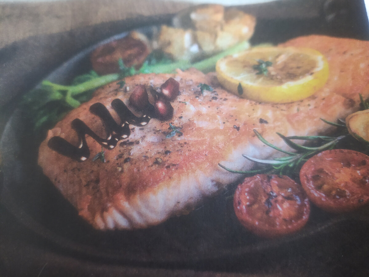Ингредиенты на 4 порции: 50 мл белого сухого вина( или 30 мл воды и 20 г белого винного уксуса) 2 ст. л. коричневого сахара 3 веточки тимьяна 1 зубчик чеснока 1/2 лимона 1 апельсин 4 филе лосося по 180 г Соль по вкусу Листья салата и зерна граната для подачи. Приготовление: 1. Разогрейте духовку до 190 градусов 2. Для глазури в маленьком ковше смешайте гранатовый соус Наршараб, вино, сахар, веточки темьяна, мелко нарезанный зубчик чеснока, сок лимона и тонко снятую цедру лимона и апельсина. Доведите до кипения и уваривайте 10-15 минут на малом огне. 3. Апельсин нарежьте на 4 кружка, выложите на противень. На каждый кружок положите филе кожей вниз. Приправьте филе солью и перцем, полейте глазурью, разровняйте по всей поверхности. 4. Поставьте в духовку и запекайте 12-15 минут, пока филе не станет матовым по всей толщине. 5. Переложите филе с ломтиков апельсина на листья салата, посыпьте гранатовыми зернами. Совет: Апельсин служит лишь подложкой под рыбу. Его можно заменить на луковые к