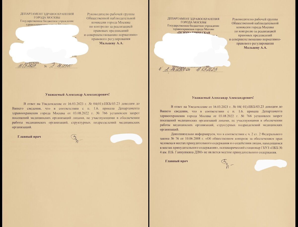 Удивительные вещи творятся в организациях Департамента здравоохранения города Москвы, где граждане проходят принудительное или недобровольное лечение. Речь идёт о психиатрических больницах. После получения обращения от гражданина, находившегося на лечении в одной из таких больниц, направились с коллегой - членом ОНК г. Москвы Мальцевым А. А. - осуществить общественный контроль. В соответствии с существующими нормами своевременно уведомили необходимые органы, не смотря на что, начиная с пункта охраны, сотрудники ПКБ стали чинить нам препятствия. Сотрудники охраны (представители ЧОП), заместитель главного врача по медицинской части, заместитель главного врача по гражданской обороне, специалист по безопасности и даже начальник юридического отдела - категорически отказались пропускать нас на территорию больницы, ссылаясь на приказы, не имеющие отношения к работе членов ОНК. Сотрудники больницы постоянно давали нам противоречивую информацию, путаясь в собственных данных: например, то