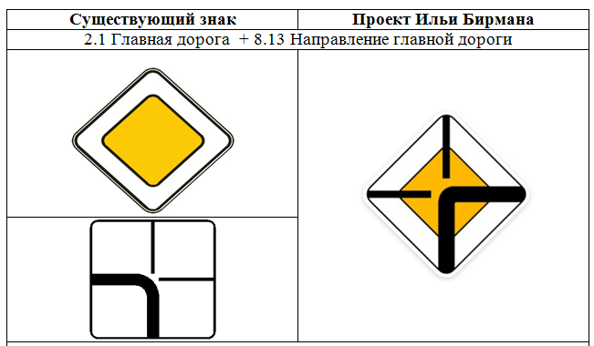 Известный российский дизайнер Илья Бирман, которому весьма близка тема визуальной навигации, опубликовал на своем сайте дизайн новых дорожных знаков. Разумеется, эти знаки только фантазия автора, и хвалить или ругать их - дело каждого. От себя отмечу, что несмотря на хороший посыл по визуальному уточнению информации (например отличные решения с приоритетным направлением движения и запретом парковки), некоторые решения остаются сомнительными. Например "круглые" знаки на прямоугольном щите. Вроде только удалось победить эту глупость на световозвратных жёлтых щитах, как опять мы видим попытки скрестить круг и квадрат. Но в остальном посыл автора очень радует. В соответствии с ГОСТ 52289-2019, Табличку 8.13 "Направление главной дороги" применяют со знаками 2.1, 2.4, 2.5 для указания направления главной дороги на перекрестке, где она изменяет свое направление. Предложение дизайнера кажется отличным решением по тому, как объеденить 2 знака в 1. В выигрыше все: водителям понятней, дорожникам