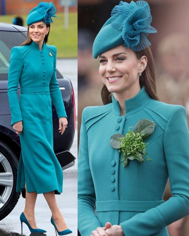 Сегодня в Британии отмечается День Святого Патрика, в честь этого события состоялся парад в Олдершоте, Кэтрин его приняла первый раз в качестве полковника Ирландской гвардии, роли, принятой от супруга, принца Уильяма. Интересно, что в прошлые годы, сопровождая принца Уильяма, Кэтрин чаще всего выбирала традиционный зелёный, за редким исключением. Вот и в этом году она появилась в бирюзовом наряде. На ней было бирюзовое пальто Кэтрин Уокер, украшенное оборками. На груди приколота брошь в форме трилистника от Cartier. Погода подвела: шёл дождь. Но несмотря на ненастье, Кэтрин раздала военным веточки трилистника. Но сначала она сама приколола трилистник к пальто: Веточка трилистника досталась талисману 1-го батальона ирландской гвардии, ирландскому псу-волкодаву Турлоу Мору. Интересный кадр: Затем она выступила с речью перед ирландскими гвардейцами, обратите внимание, - принц Уильям стоит рядом. Теперь он здесь сопровождающий. Он кстати тоже выступил в качестве бывшего полко