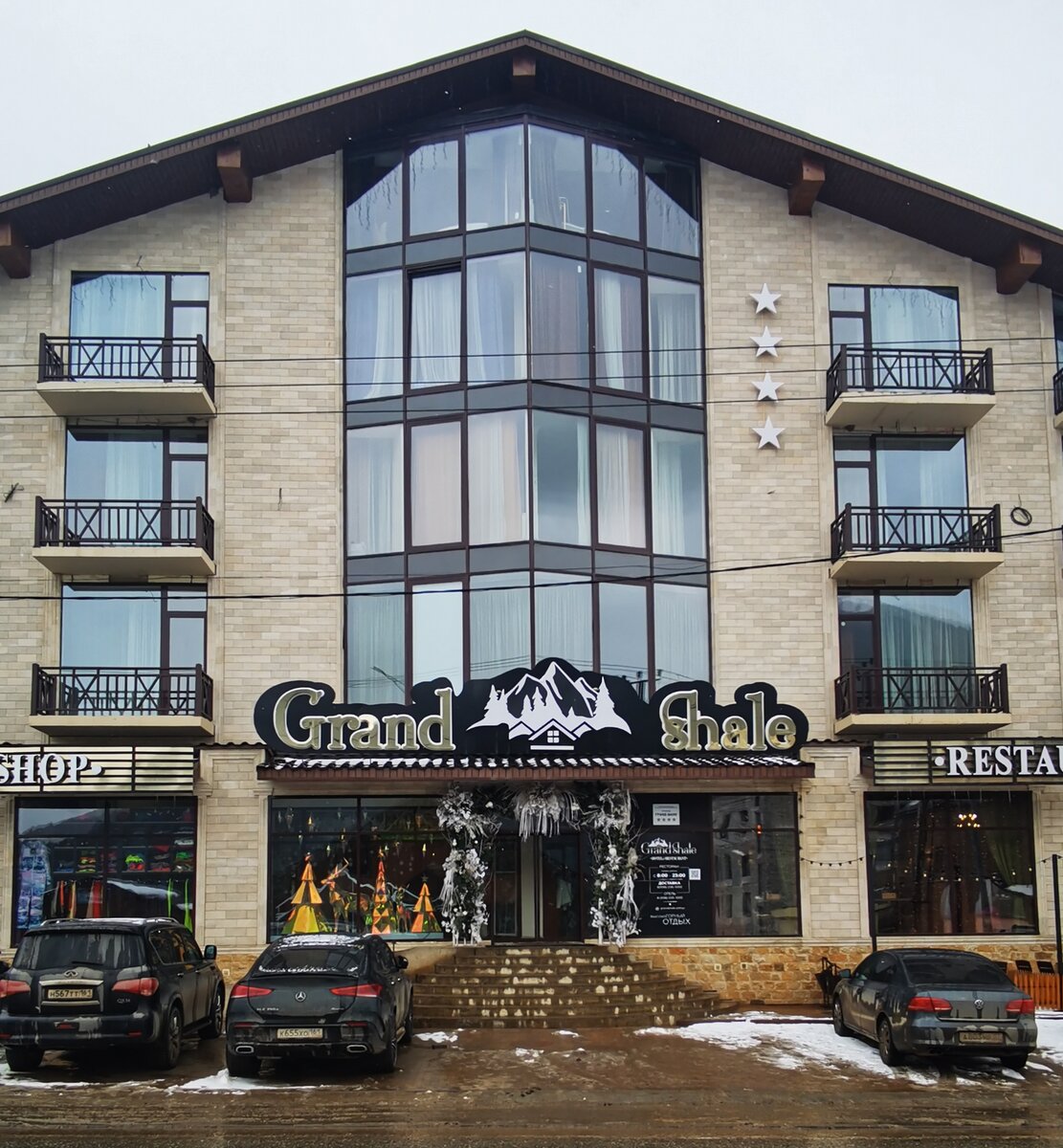 Отель Grand Shale 4* на улице Ленина - единственный отель современного формата категории 4* в жилой (исторической) части села Архыз. Даже внешне он выделяется и смотрится почти чужаком среди низких, преимущественно одноэтажных жилых домов и павильонов.