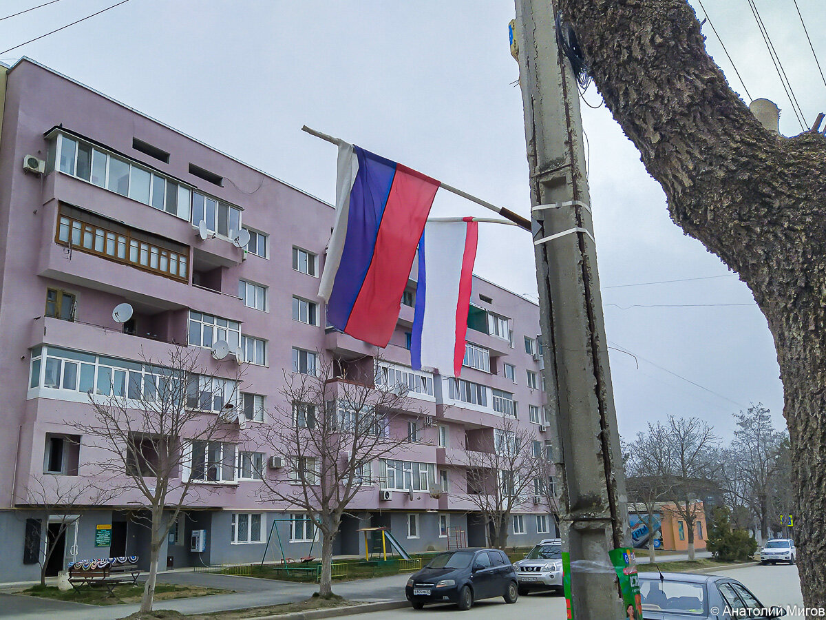 На улицах нашего городка Старый Крым развеваются флаги - один российский, а второй государственный флаг Республики Крым. 18 марта - День воссоединения Крыма с Россией. Произошло это 9 лет назад. С тех пор в Крыму этот день праздничный. Как завтра в городе будут отмечать этот праздник, я пока ещё не знаю. А сегодня на главной улице сажали можжевельники. Хорошее дело. Тут и так уже много вечнозелёных растений, а будет ещё больше. В межсезонье, когда нет ни листьев, ни цветов, это очень украшает город. Красиво получается. Специально подогнали машину с бочкой воды, чтобы сразу полить. Так что к завтрашнему празднику городок ещё немного похорошел. И это радует.