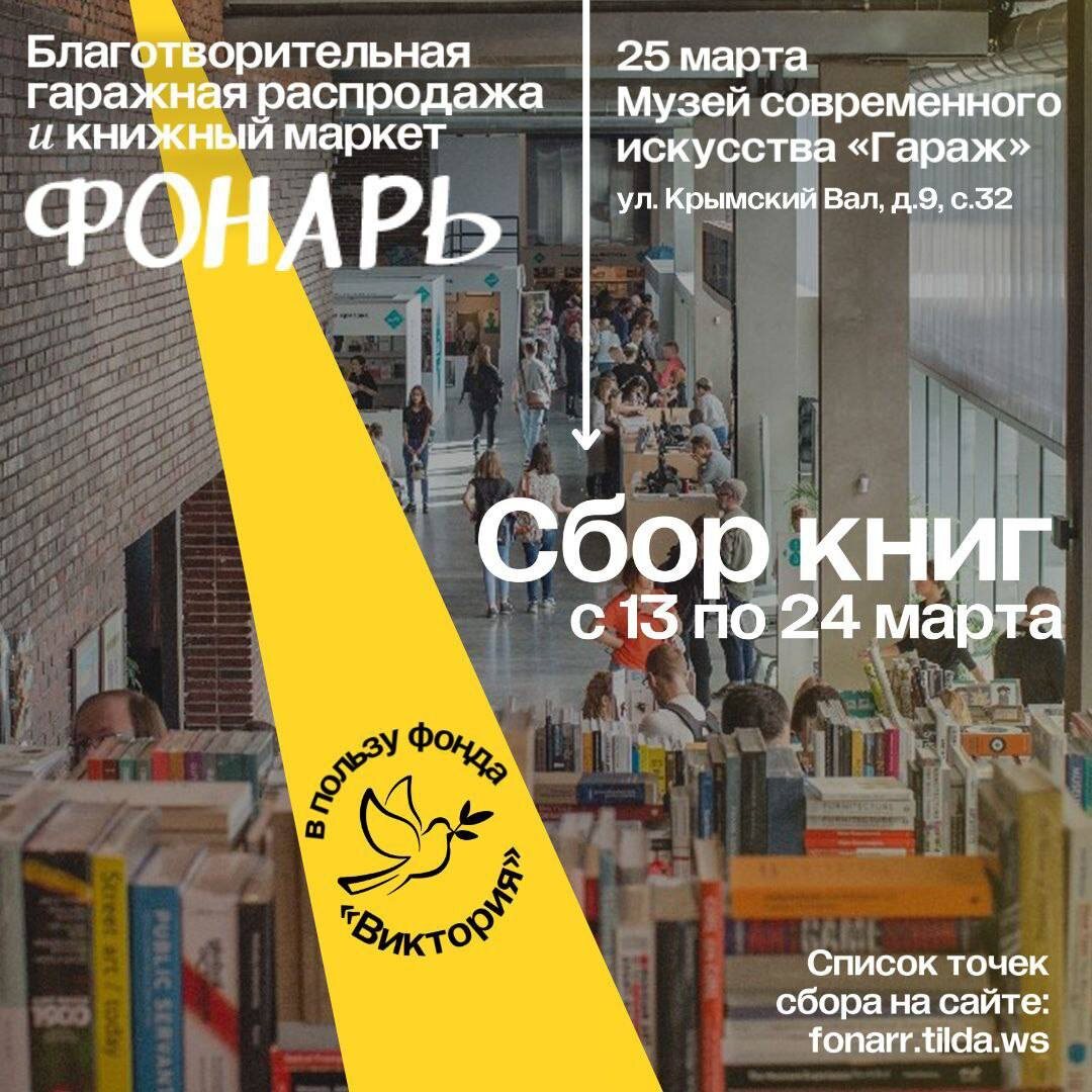 Друзья, наше издательство участвует в книжном маркете «Фонарь», который пройдёт 25 марта в музее современного искусства «Гараж» в Парке Горького. Мы приглашаем вас присоединиться к этой благотворительной гаражной распродаже! В московский офис редакции можно принести детские и взрослые книги в хорошем состоянии, вышедшие не раньше 2003 года: Куда принести книги? До 24 марта книги можно приносить в офис редакции «Архипелага» по адресу: г. Москва, ул. Воронцовская 35Бк1, офис 15. Мы открыты с понедельника по пятницу с 9:00 до 18:00. О маркете: Первый «Фонарь» в 2023 году пройдёт в пользу Благотворительного детского фонда «Виктория». Тема этого года: НеОдиночество. Тему НеОдиночества на «Фонаре» будут обсуждать самые яркие современные авторы, книги которых стали событиями в литературном процессе последних лет, психологи, художники, публицисты. Будет также большая детская программа и много мастер-классов для взрослых и детей от лучших книжных иллюстраторов, чтения книг и стихов. По всем воп