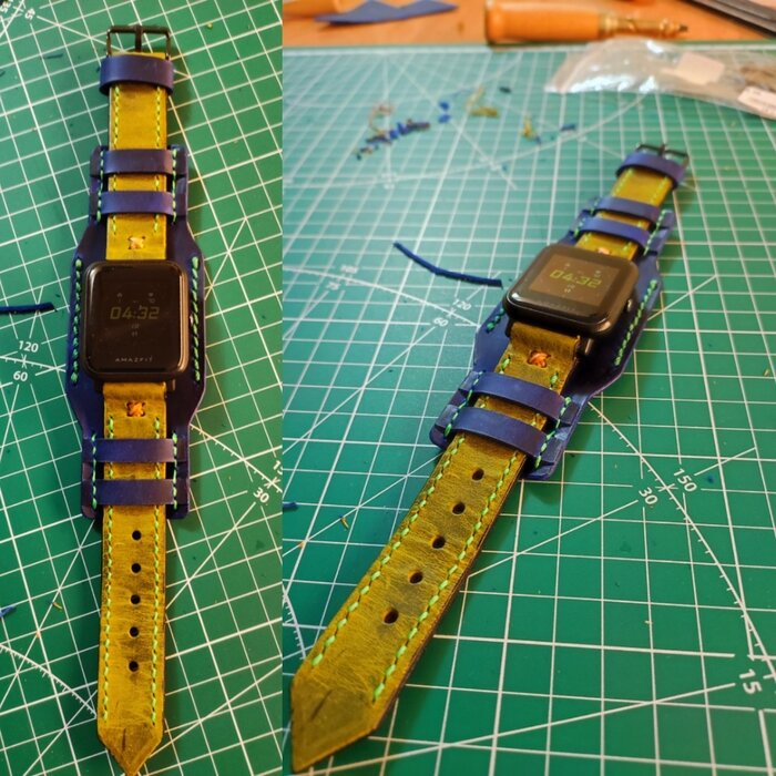 Всём доброго вечера, решил сделать ремень на свои часы Xiaomi, знаю что обещал сделать картхолдер, но кожа всё ещё идёт и для этих целей я купил краст тёмно-синего цвета. На этот раз швы были ровнее благодаря купленным пробойникам с нормальной заточкой, ощутил настоящий кайф работая с хорошим инструментом) Купил набор строчных пробойников 4мм и круглые 1мм диаметром. Использовал 0.8 мм нитки вощеные зелёного цвета, обычные 0.45 мм зелёного цвета и бежевые (но это не точно) цвета 0.8 тоже вощеные. С обратной стороной тоже решил заморочиться) Вот полный набор, не без косяков, отверстия пот язычок получились не по центру, но это исключительно мой косяк, в целом я очень доволен работой! Пост автора Dumonbro29. Узнать, что думают пикабушники.