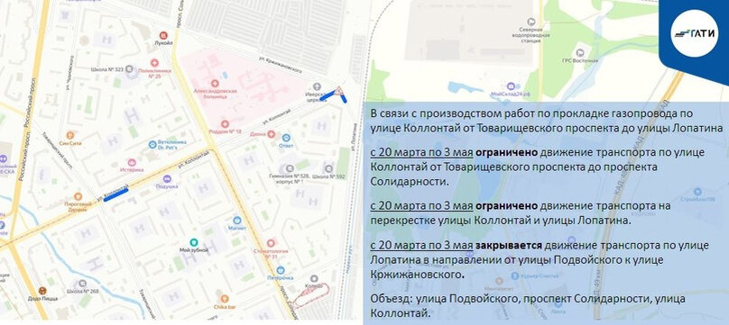Улицу Коллонтай сузят до начала мая ради прокладки газопровода Строительство коммуникаций с 20 марта добавит перекрытий и ограничений на улицах Невского и Выборгского районов Петербурга. Об этом 17 марта предупреждает пресс-служба государственной административно-технической инспекции. На участке улицы Коллонтай от Товарищевского проспекта до улицы Лопатина будут прокладывать газопровод. В связи с этим с 20 марта по 3 мая ограничат движение по Коллонтай от Товарищевского проспекта до проспекта Солидарности и на перекрестке улицы Коллонтай с улицей Лопатина, а также закроют проезд по улице Лопатина в направлении от улицы Подвойского к улице Кржижановского. Объехать можно будет по улице Подвойского, проспекту Солидарности и улице Коллонтай. В Левашово водителей подвинут для строительства инженерных сетей. С 20 по 29 марта там перекроют движение по Ручейной улице от проспекта Карпова до проспекта Карла Маркса. Объезд предусмотрен по проспекту Карла Маркса, Песочной улице, проспекту Карпова